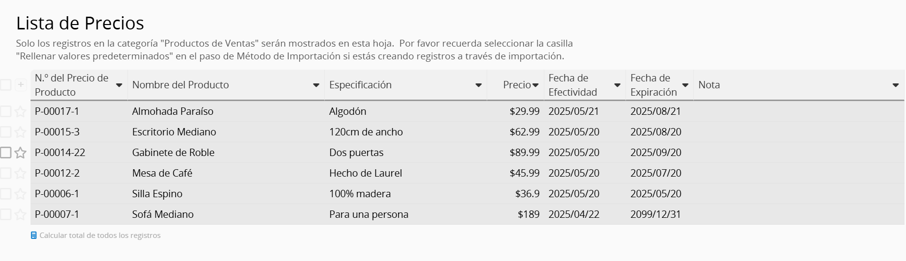 2. Lista de Precios, donde el precio de un producto es guardado como un registro.
