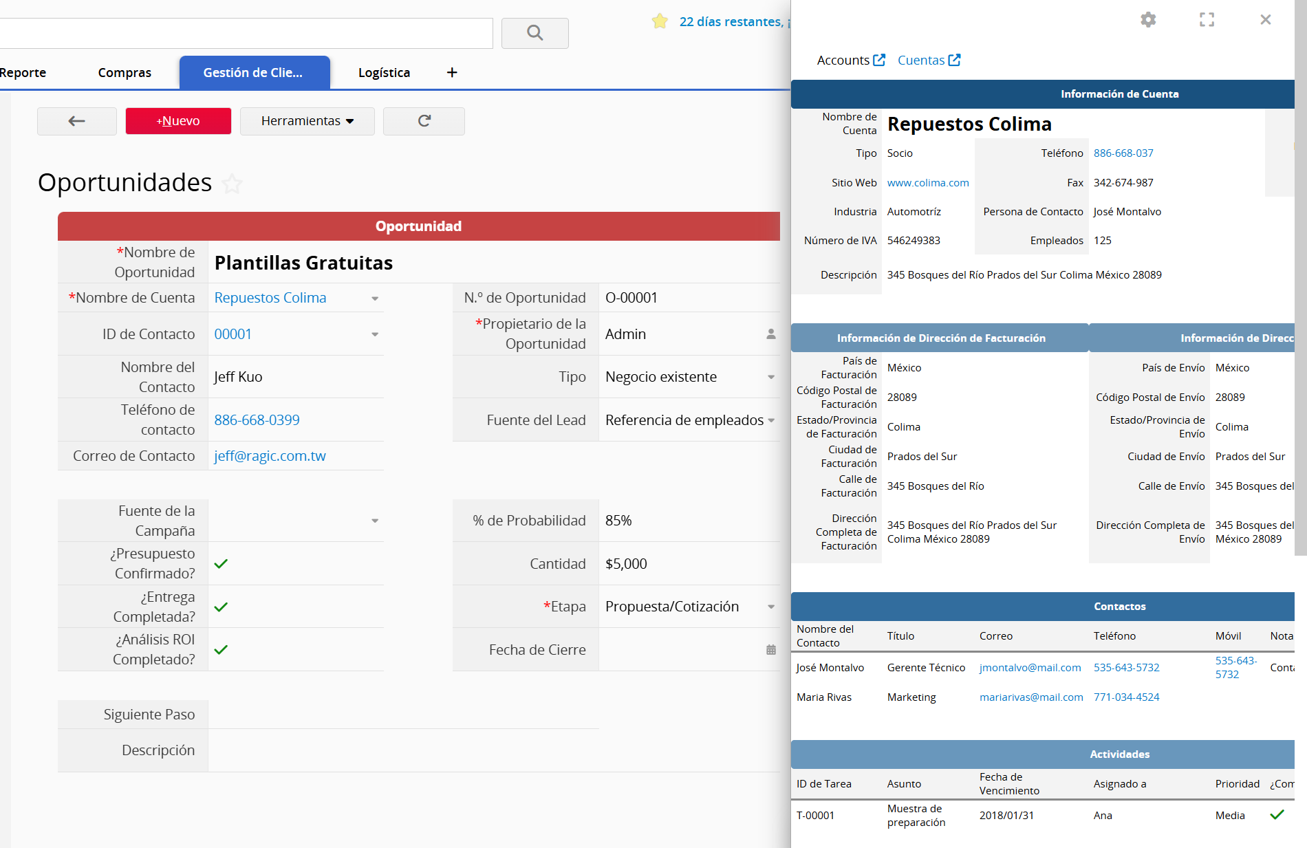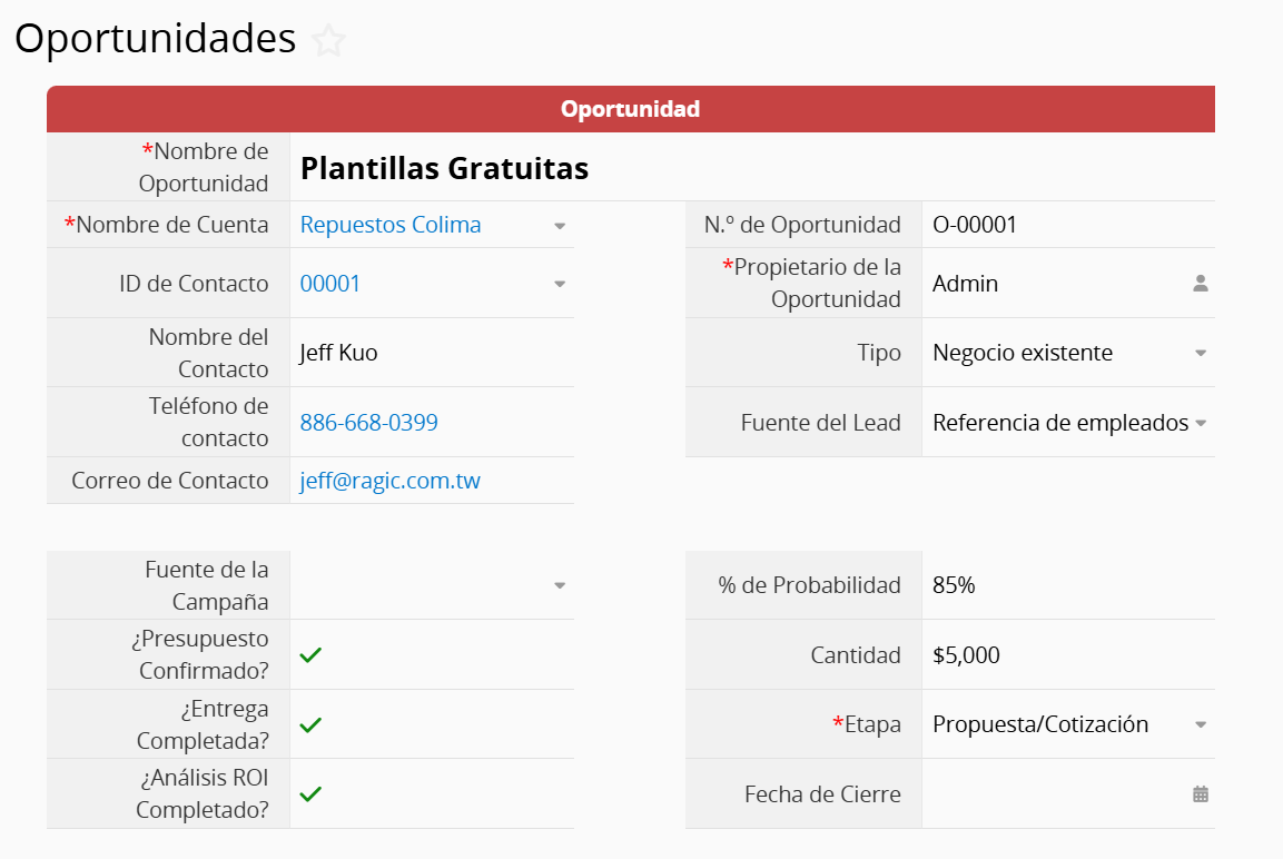 El campo Nombre de Cuenta en este campo está enlazado a la hoja Cuentas, desde la cual puedes elegir Cuentas (empresas) y Contactos relacionados a esta oportunidad de ventas. Se ha aplicado filtro dinámico al campo Contacto (el cual está enlazado a la hoja Contactos), filtrando solo la información de contacto afiliada a la empresa seleccionada.