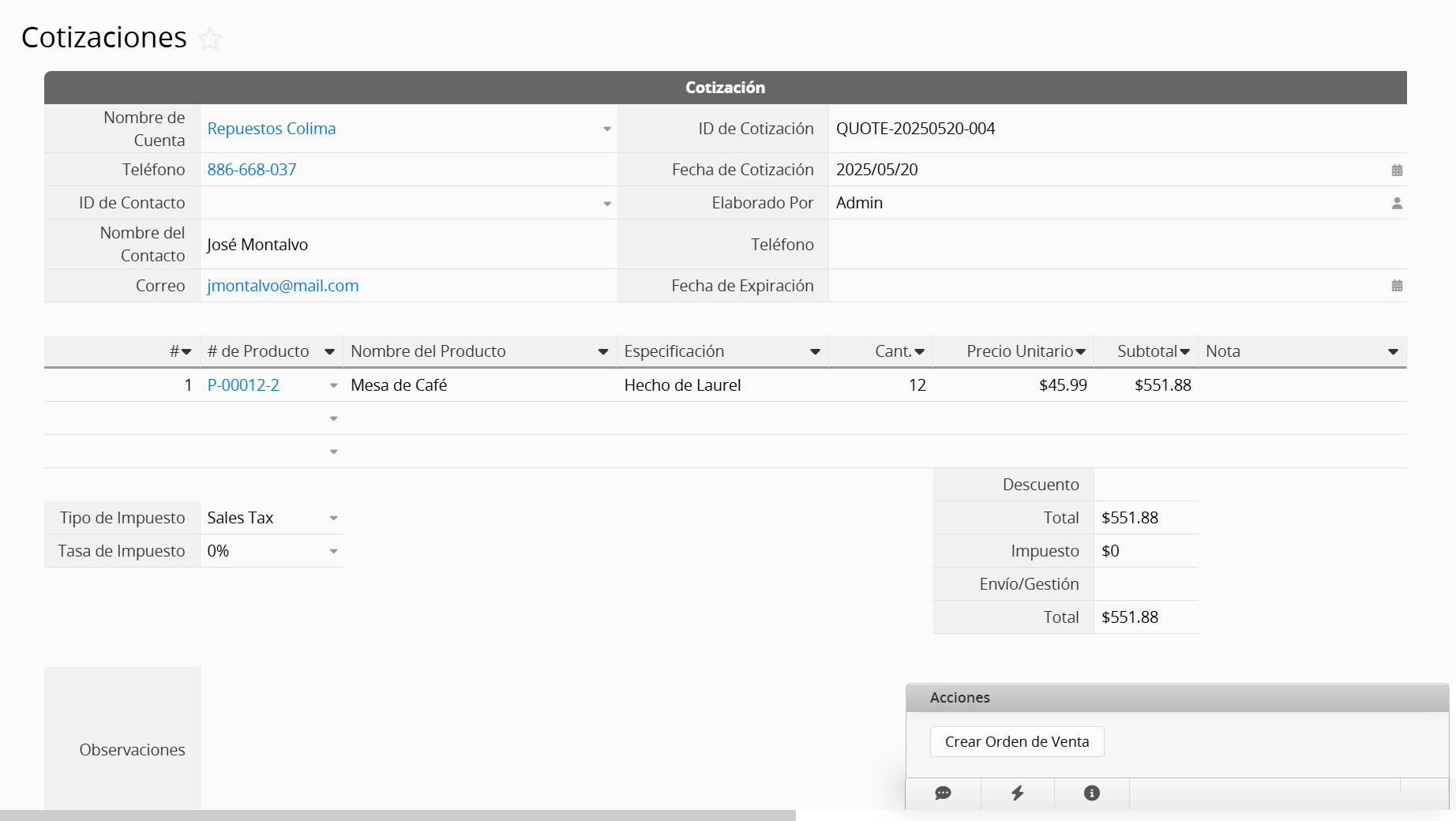 Si instalas la plantilla Gestión de Órdenes de Ventas, también puedes convertir el registro de la cotización aceptada a “Orden de Venta” al hacer clic en el botón de acción “Crear OD” en la parte inferior derecha del formulario.