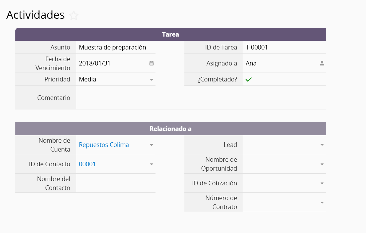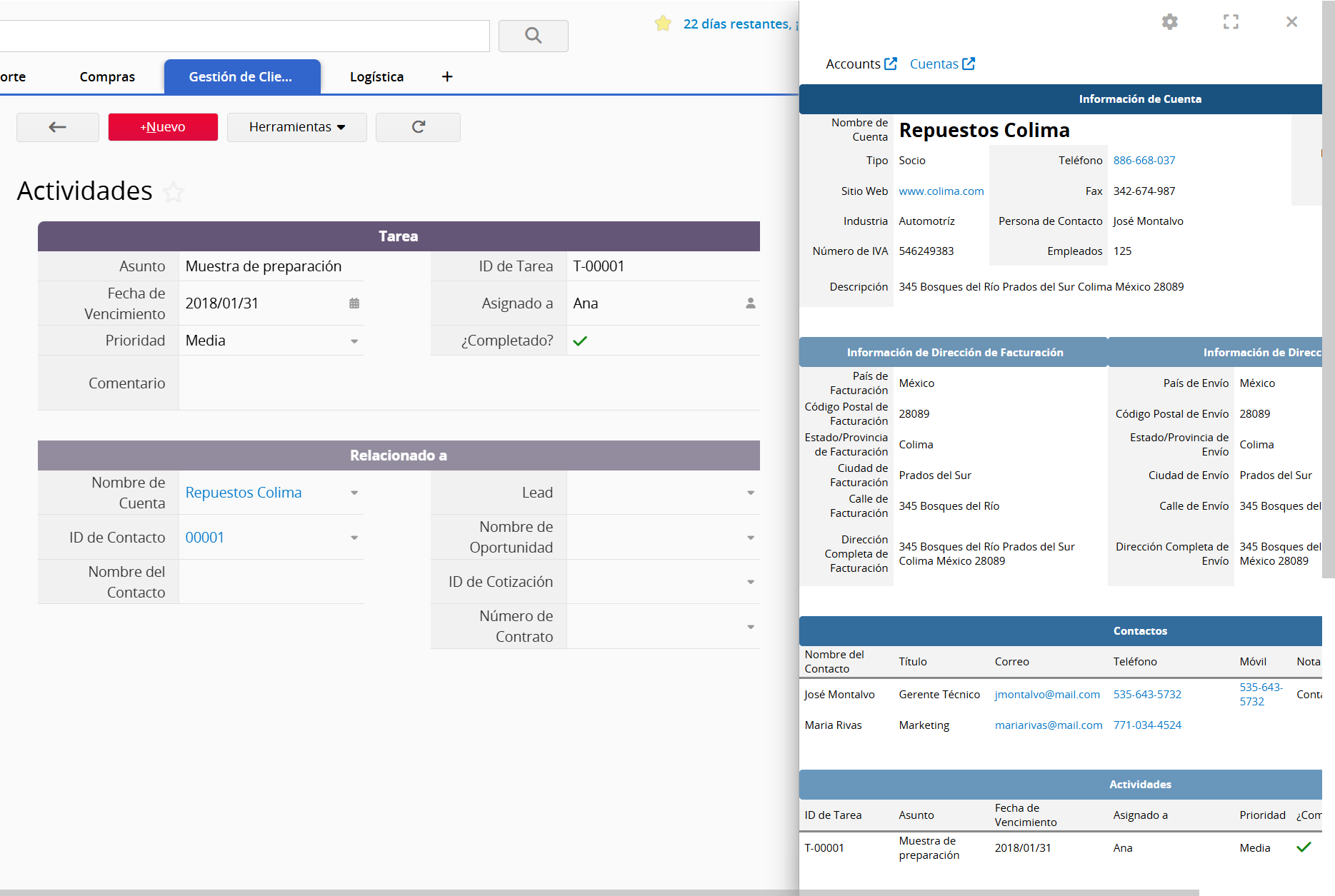 La información ingresada en la sección “Relacionada a”, tal como cliente (empresa) a quien la actividad está relacionada, también se mostrará en la hoja de las empresas Cuentas sheet (subtabla “Actividad”).