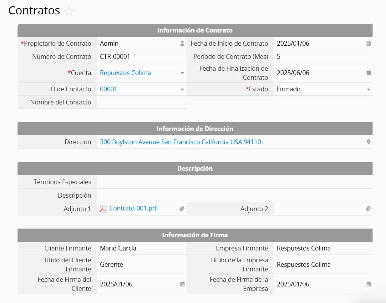También puedes cargar el archivo de contrato en el campo de archivo adjunto bajo la sección Información de Descripción, así como a la información de firma en la sección inferior.