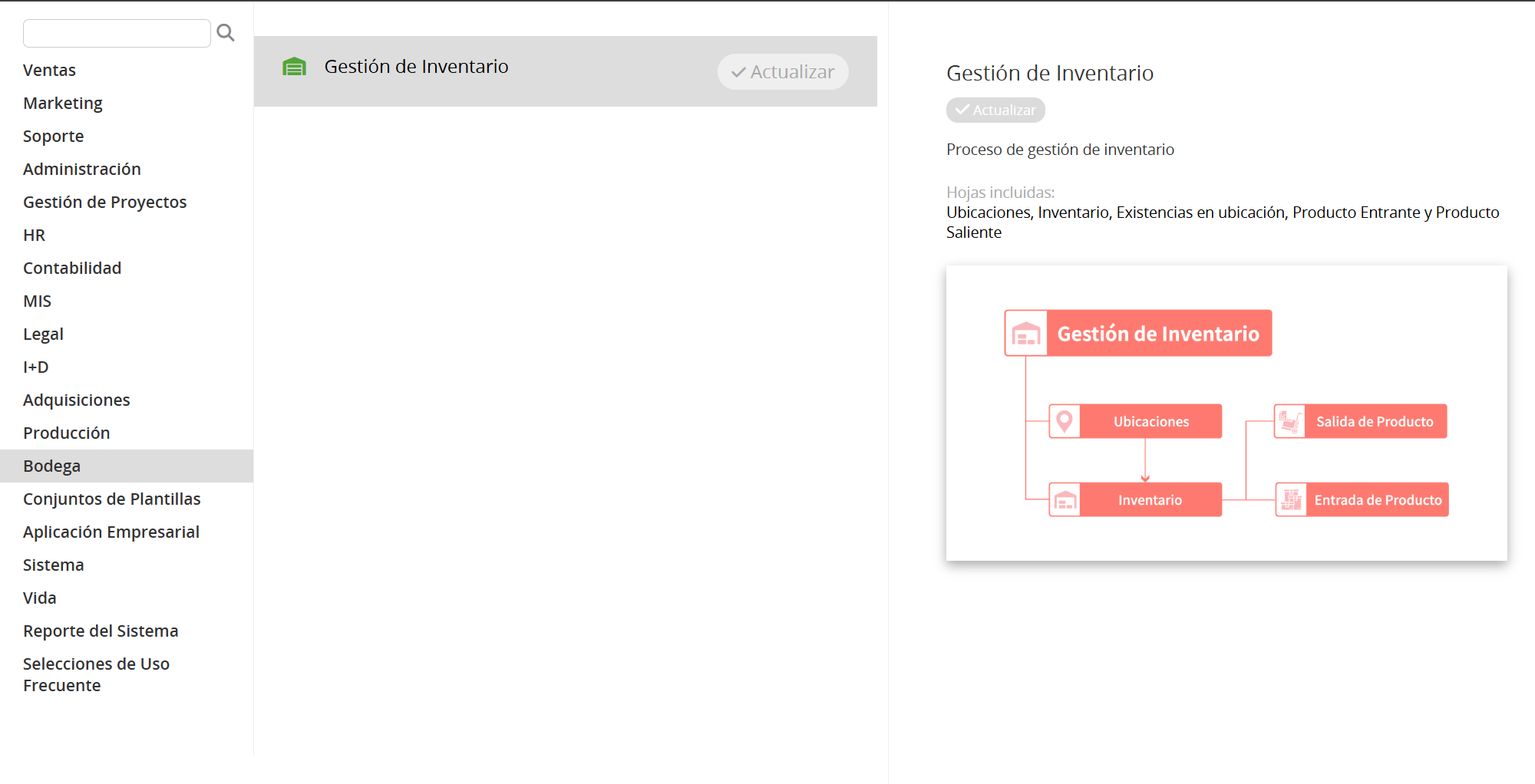 La plantilla de gestión de inventario está designada para gestionar inventario desde ubicaciones a cantidades totales en cada ubicación. También maneja hojas relacionadas con el cambio de inventario tales como Salida de Producto, Entrada de Producto y Transferencia de Inventario.