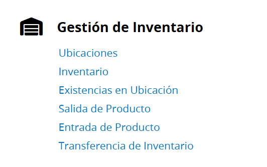 Ubicaciones → Inventario (Ubicación de Balance), (Salida de Producto), (Entrada de Producto), (Transferencia de Inventario)