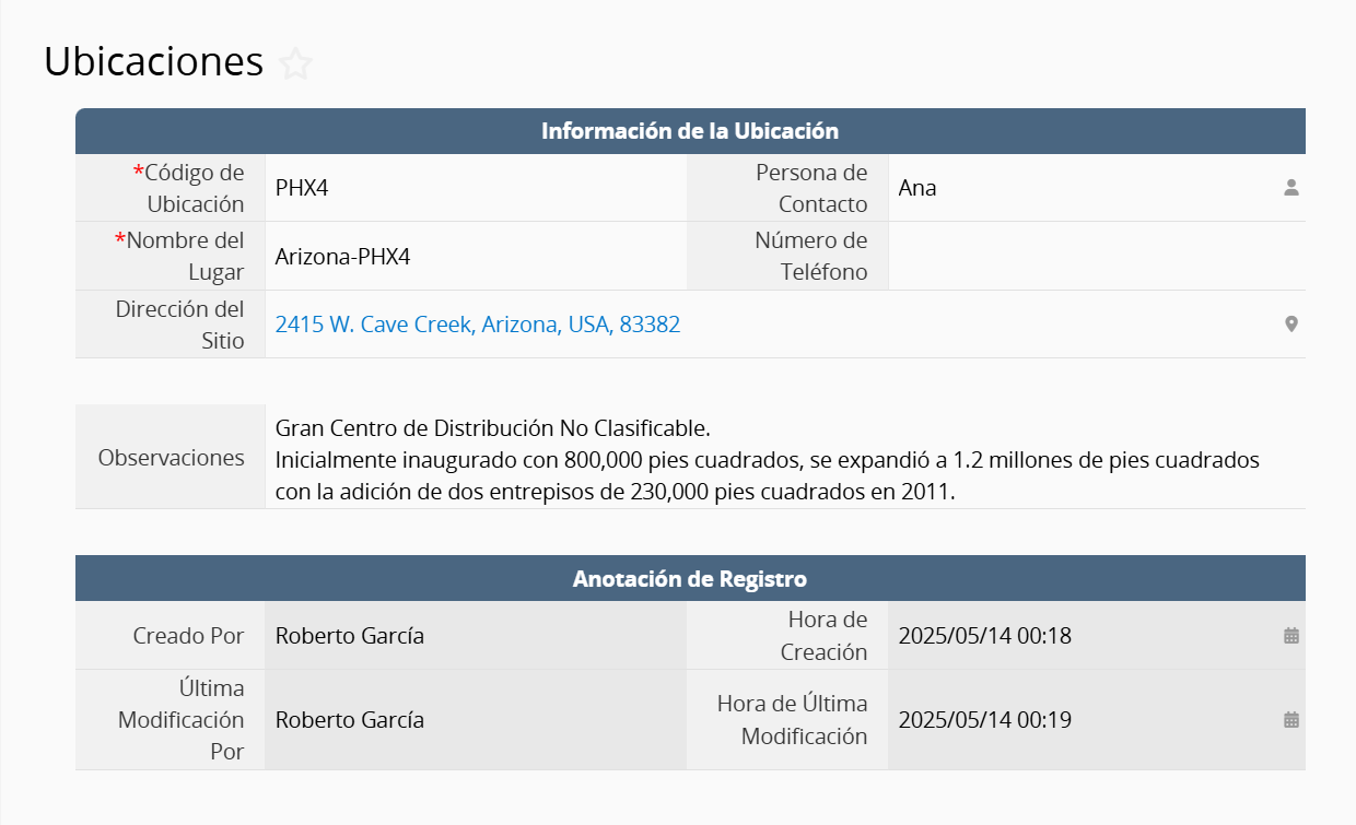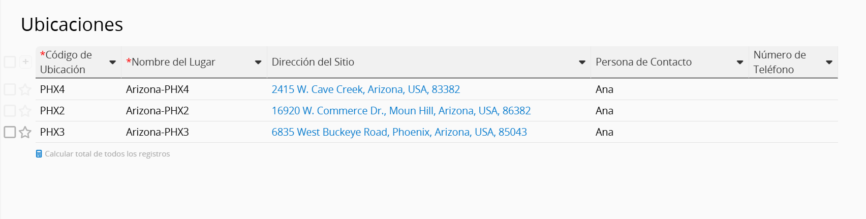 La hoja de ubicaciones es usada para administrar información en diferentes ubicaciones. El Código de Ubicación debe ser un valor único y al igual que el Nombre de Ubicación, es requerido.