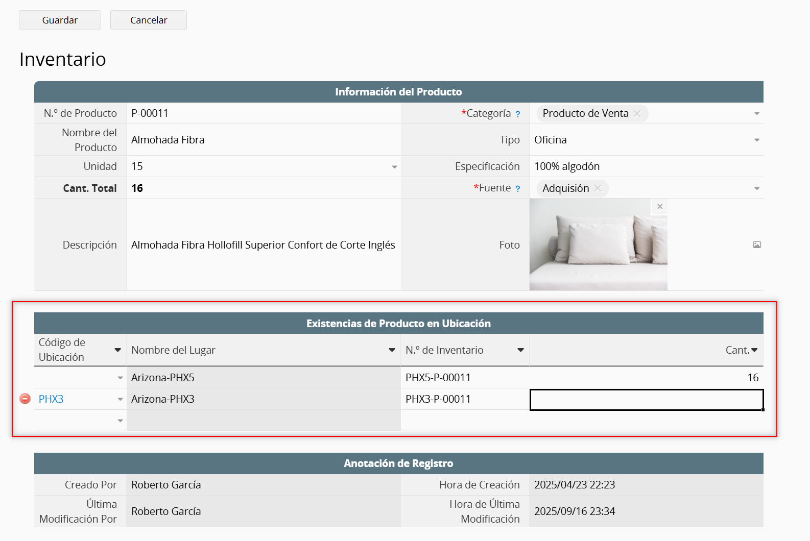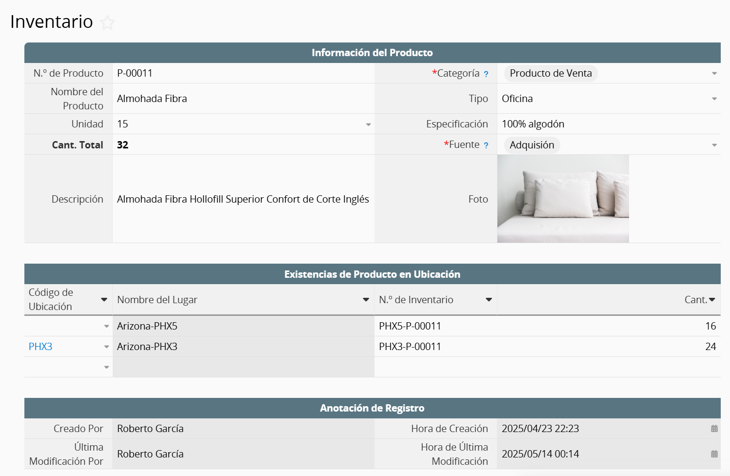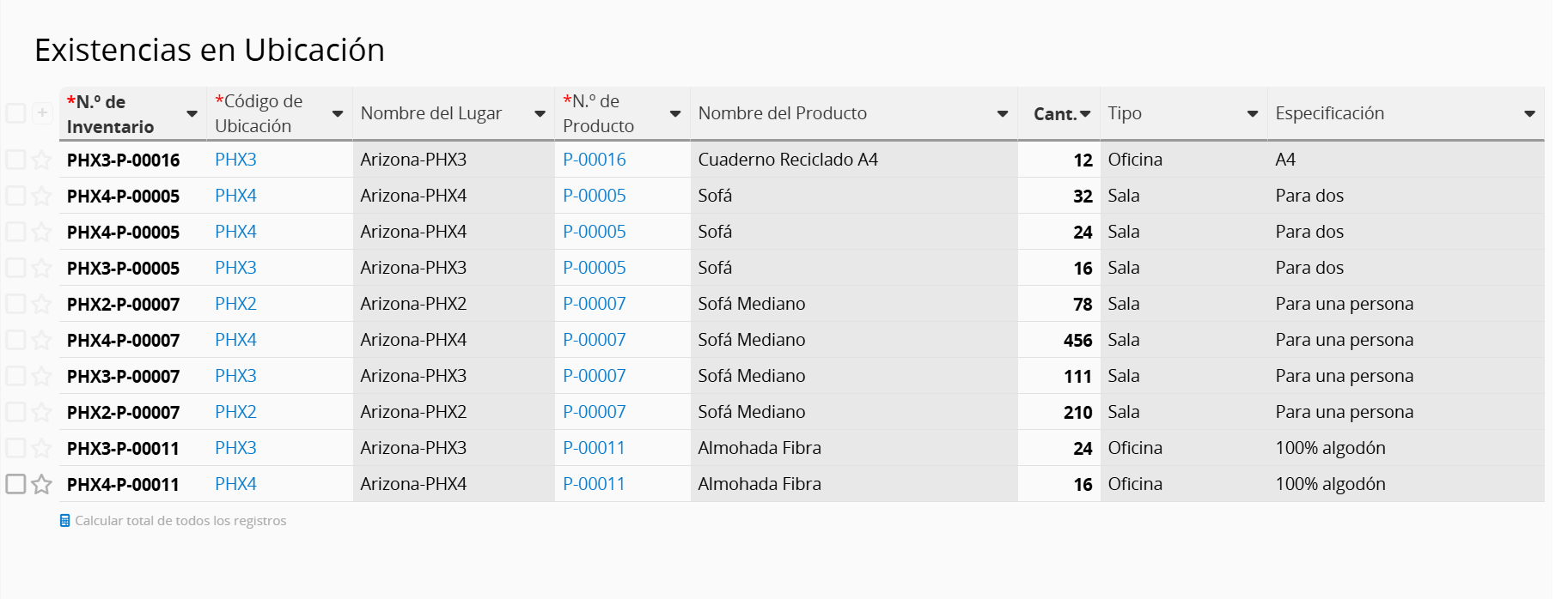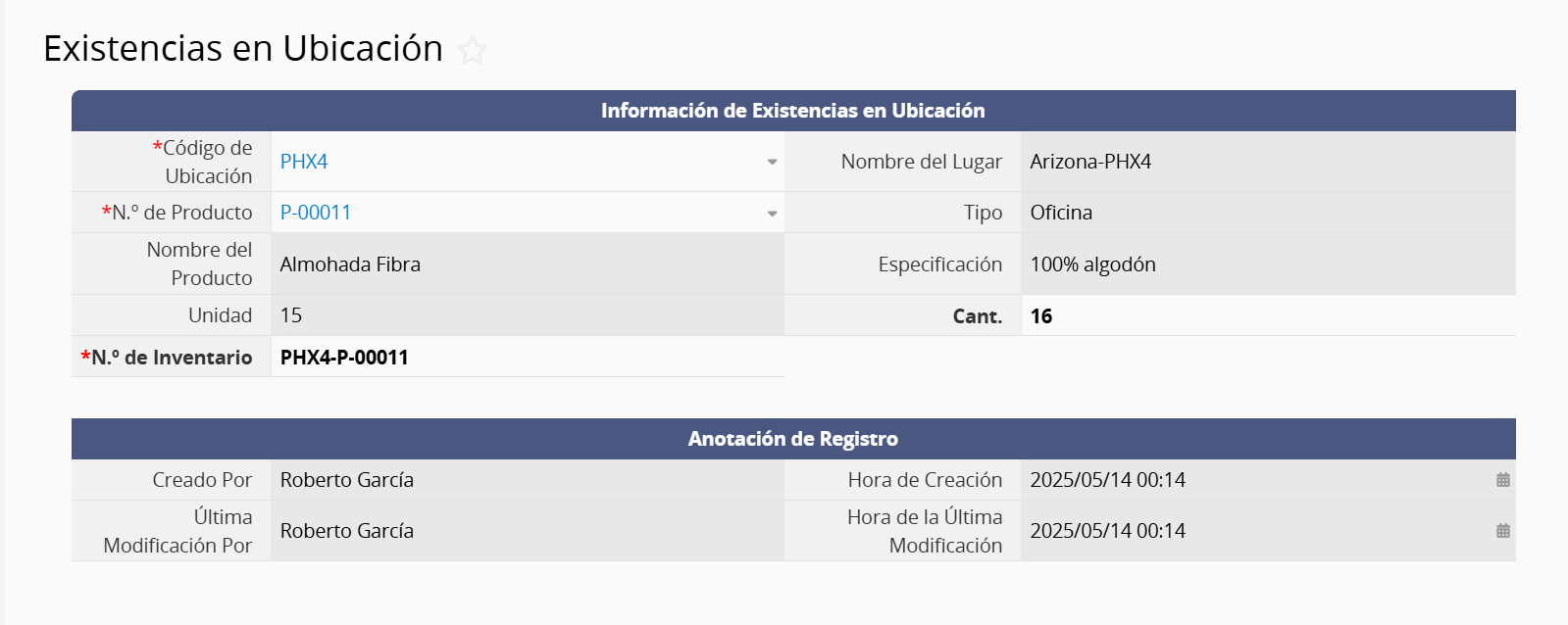 Esta se usa para registrar la cantidad de un producto en una ubicación. El valor actual del No de Inventario es “Cód. de Locación-No de Producto” y es único en esta hoja.