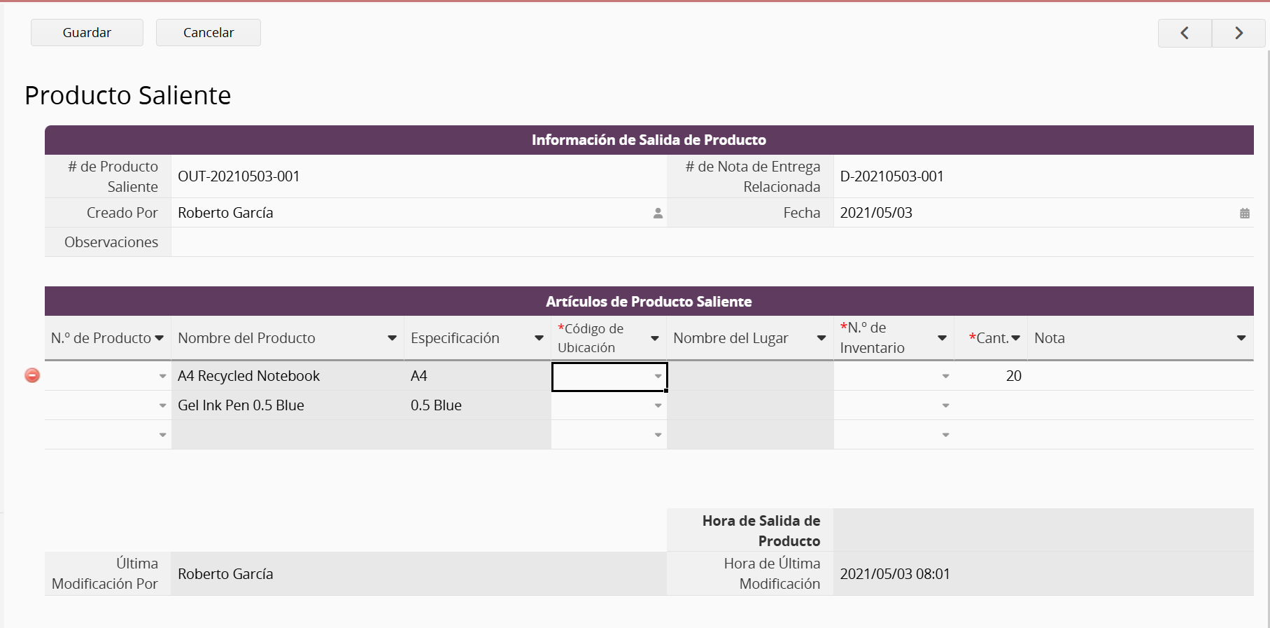 El registro de salida de producto puede ser creado al convertir un registro de la Nota de Entrega en la plantilla de Gestión de Órdenes de Ventas, o manualmente creando un registro en la hoja Salida de Producto. En la subtabla Productos de Salida, selecciona Cód. de Ubicación para determinar la ubicación del inventario desde la cual se enviarán los productos. Luego selecciona No de Inventario y confirma la Cantidad del producto de salida.