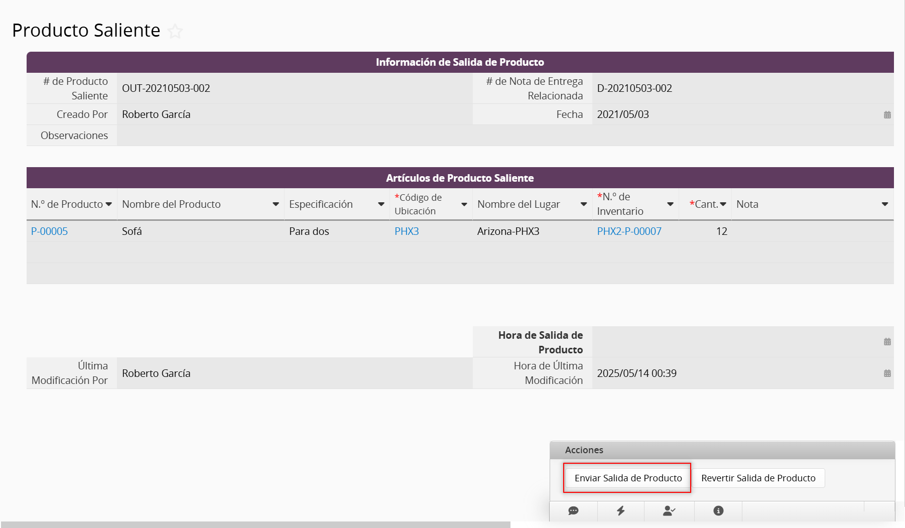 Después de crear todos los registros en la hoja Salida de Producto, puedes iniciar el flujo de aprobación. Cuando el registro es aprobado, puedes hacer clic en el botón “Enviar Salida de Producto”, y el sistema restará la cantidad del producto saliente de Ubicación de Balance y rellenará la Hora de Salida (fecha y hora de cuando el botín es ejecutado) automáticamente en la hoja Salida de Producto.
