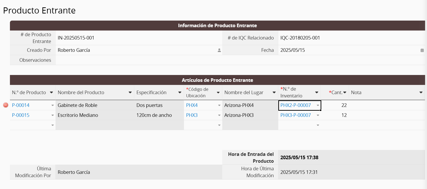 El registro de entrada de producto puede ser creado al convertir un registro de Control de Calidad Entrante en la plantilla Gestión de Compras, o al crear el registro manualmente en la hoja Entrada de Producto. En la subtabla Entrada de Producto, selecciona un Código de Ubicación para determinar la ubicación del inventario en la cual se almacenará el producto. Luego, selecciona No de Inventario y confirma la Cantidad del producto entrante.