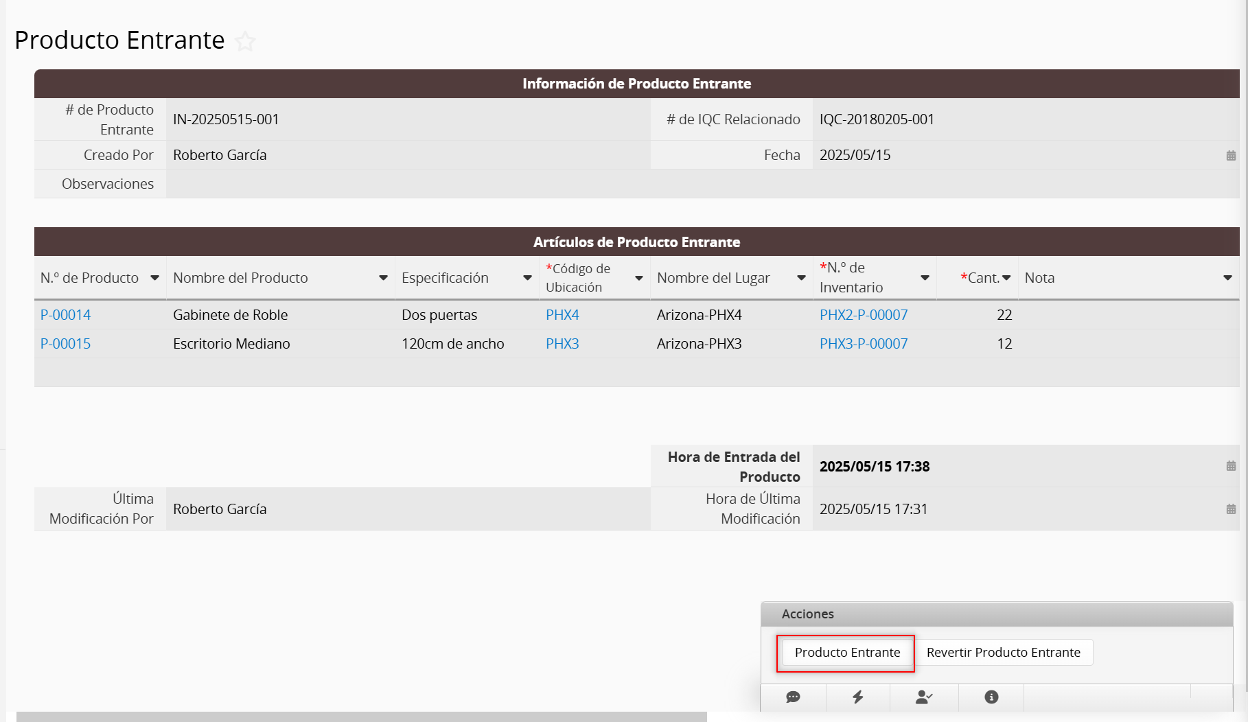 Después de crear registros en Producto Entrante, puedes iniciar el el flujo de aprobación. Cuando el registro sea aprobado, haz clic en el botón “Producto Entrante” y el sistema agregará la cantidad del producto entrante a la Ubicación de Balance, y rellenará la Hora de Producto Entrante (fecha y hora cuando el botón es ejecutado) automáticamente en la hoja Producto Entrante.
