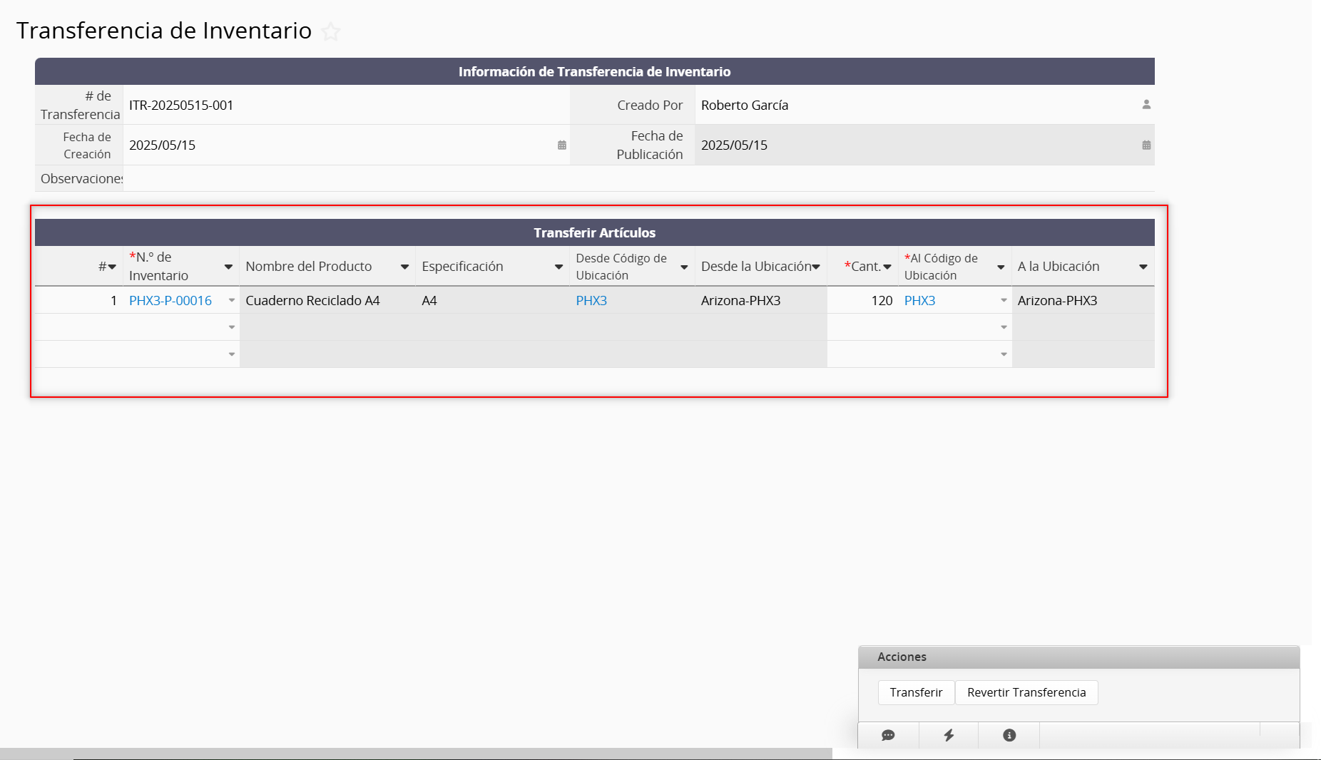 Para crear un nuevo registro para una transferencia de inventario, selecciona No de Inventario en la subtabla Elementos de Transferencia para obtener el Nombre de Producto, Especificación, Desde Cód. de Ubicación y Desde Ubicación automáticamente cargados para el producto que será transferido. Ingresa la Cantidad y selecciona A código de Ubicación, y el campo A Ubicación será automáticamente cargado.