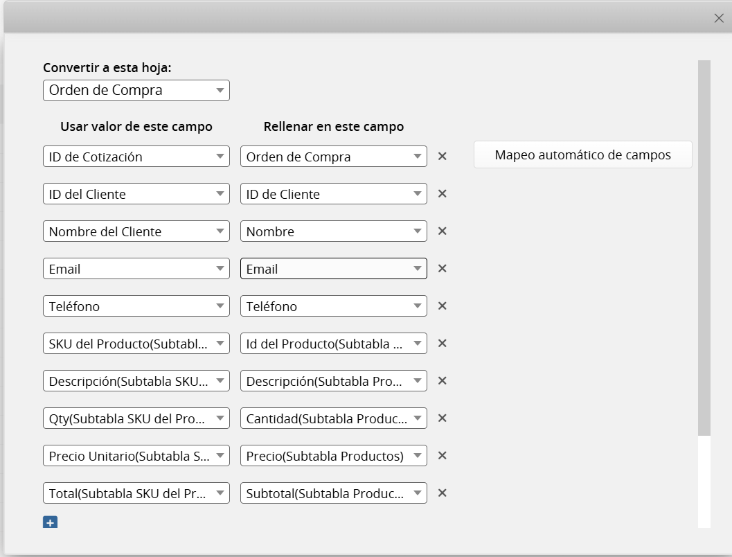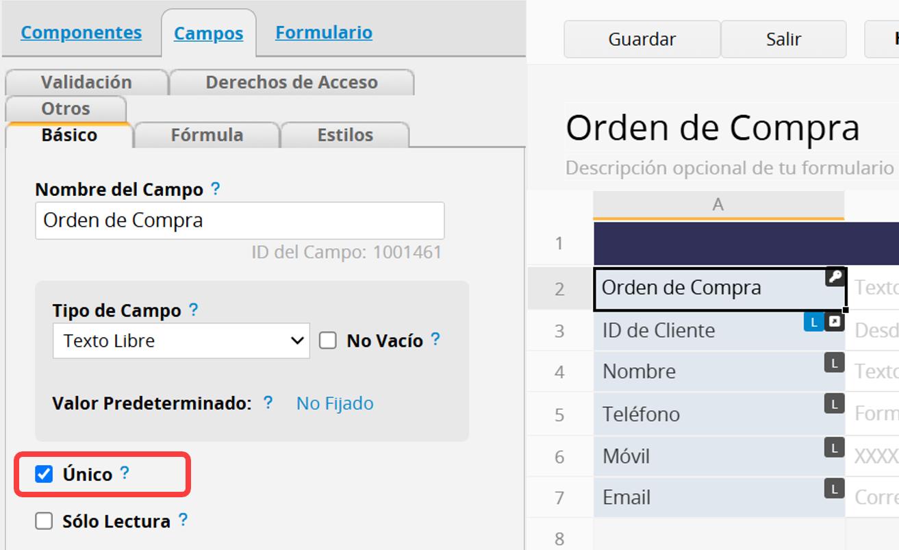 En la imagen anterior, el campo correspondiente “ID de Cotización” en la hoja destino es el campo “Orden de Compra”. Asique debes aplicar el atributo “Único” en él.