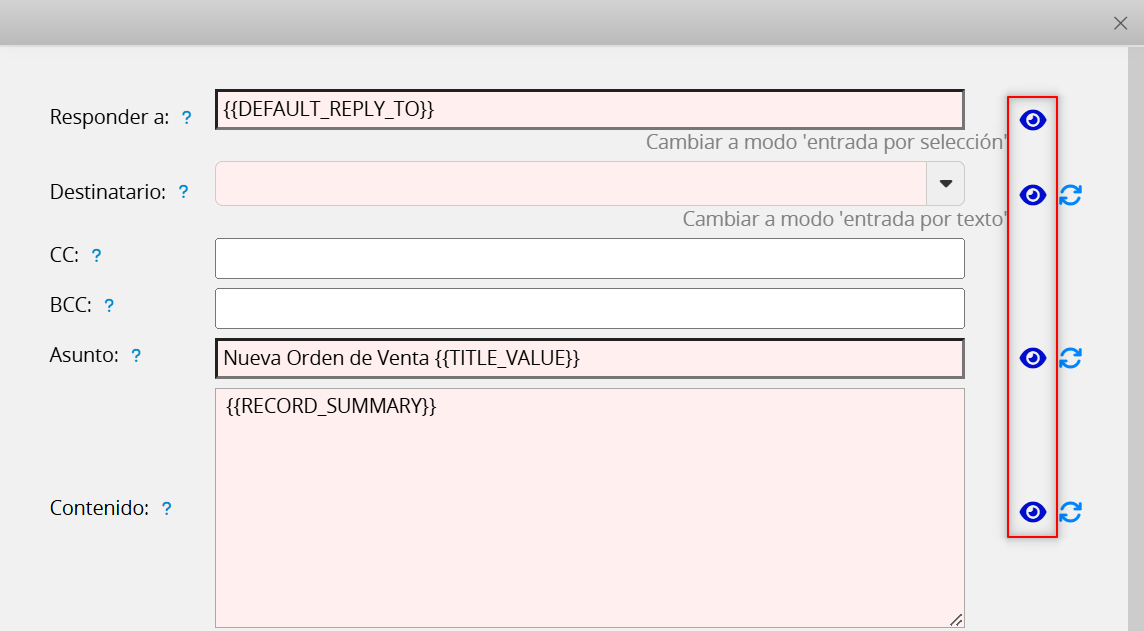 La mayoría de las funciones solo permiten que el SYSAdmin configure plantillas personalizadas, excepto envío masivo de correos y enviar este registro por correo, que los usuarios pueden personalizar.