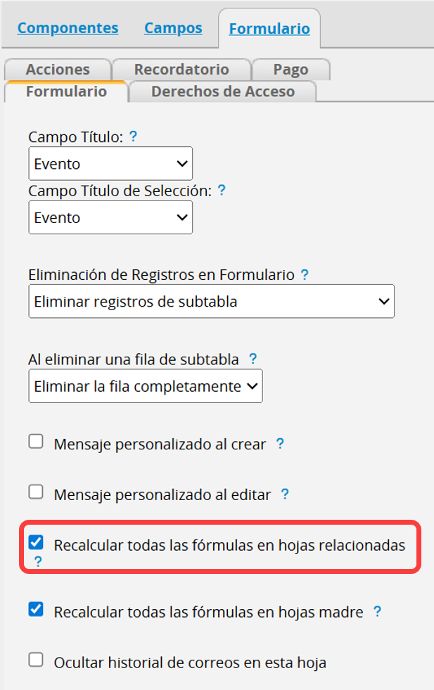 Si habilitas "Recalcular todas las fórmulas en las hojas relacionadas" en Configuración de formulario > Formulario en el modo de diseño, al guardar un registro se activará la recalculación de fórmulas para todos los registros asociados en las hojas relacionadas. Para obtener más detalles, consulta aquí.