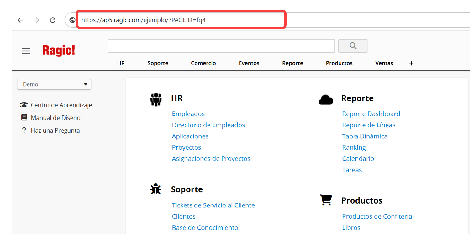 www.ragic.com/[Nombre de la cuenta]?[ID DE PÁGINA].