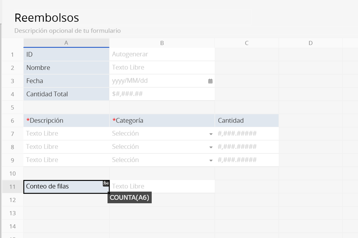 Este campo devolverá automáticamente el número actual de filas de la subtabla.