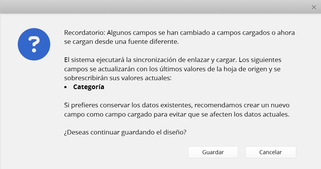 Por lo tanto, antes de cambiar un Campo Cargado, confirma si necesitas conservar los datos existentes. Si no deseas que los valores originales se sobrescriban durante la sincronización, se recomienda crear un nuevo campo para cargar los datos, a fin de evitar que se afecten los registros existentes.
