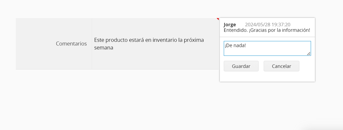 Después de guardar, otros miembros podrán ver el comentario que guardaste, Ragic mostrará un triángulo rojo en la esquina superior derecha de la celda.