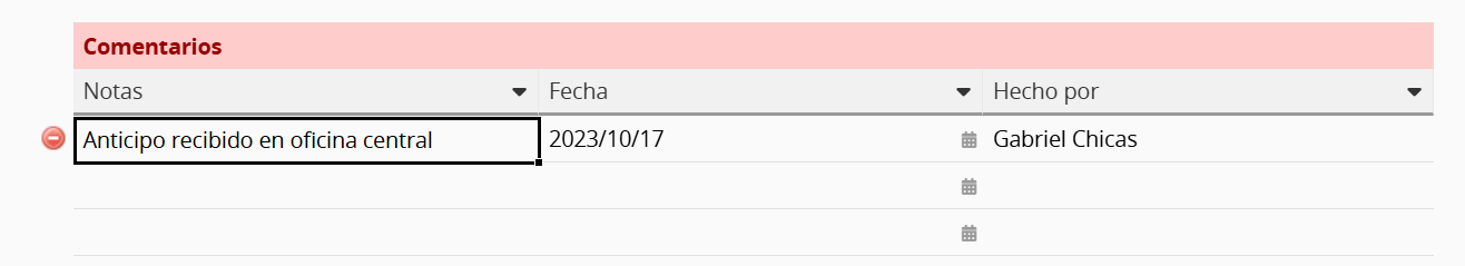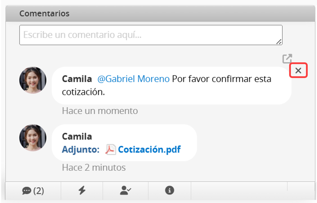 Para eliminar un comentario, coloca el cursor sobre él y haz clic en el icono "X" en la esquina superior derecha. Actualmente, solo el SYSAdmin y el usuario que comentó pueden eliminarlo.