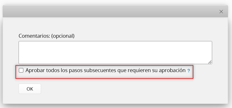 Nota: Si el administrador del sistema marca la opción Firma del aprobador requerida en la configuración avanzada de aprobación, se deshabilitará la aprobación de los pasos posteriores. Por el contrario, al habilitar Ocultar ventana comentarios, esta se procesará automáticamente y no se podrá deshabilitar.