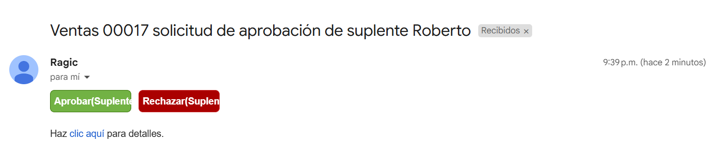 Además, el aprobador puede hacer clic en "Aprobar" o "Rechazar" directamente desde el correo electrónico de notificación.