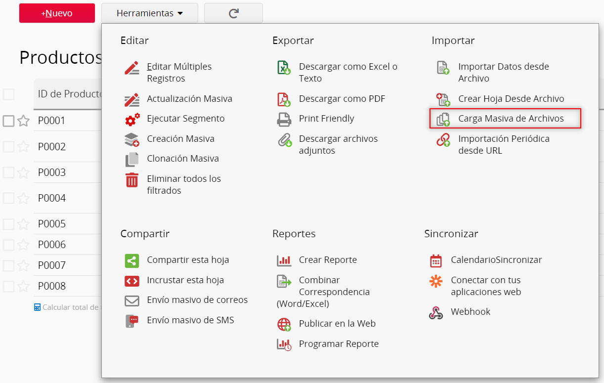 Para cargar múltiples archivos a tus registros existentes en una hoja con un campo de archivo adjunto, puedes ir a la página de listado y haz clic en Herramientas > Importar > Carga Masiva de Archivos.