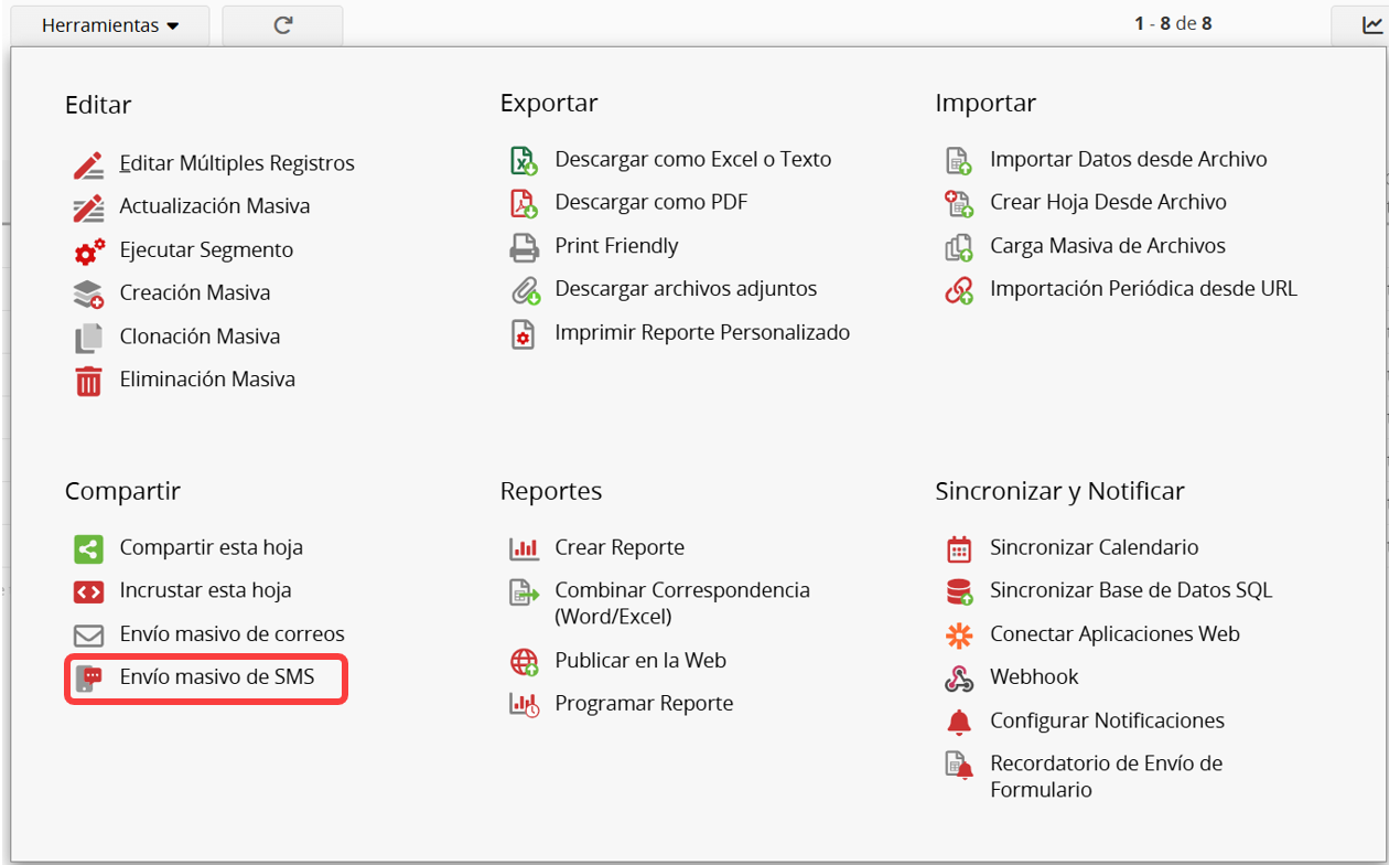 En la Página de Listado > Herramientas > Compartir > Enviar SMS.