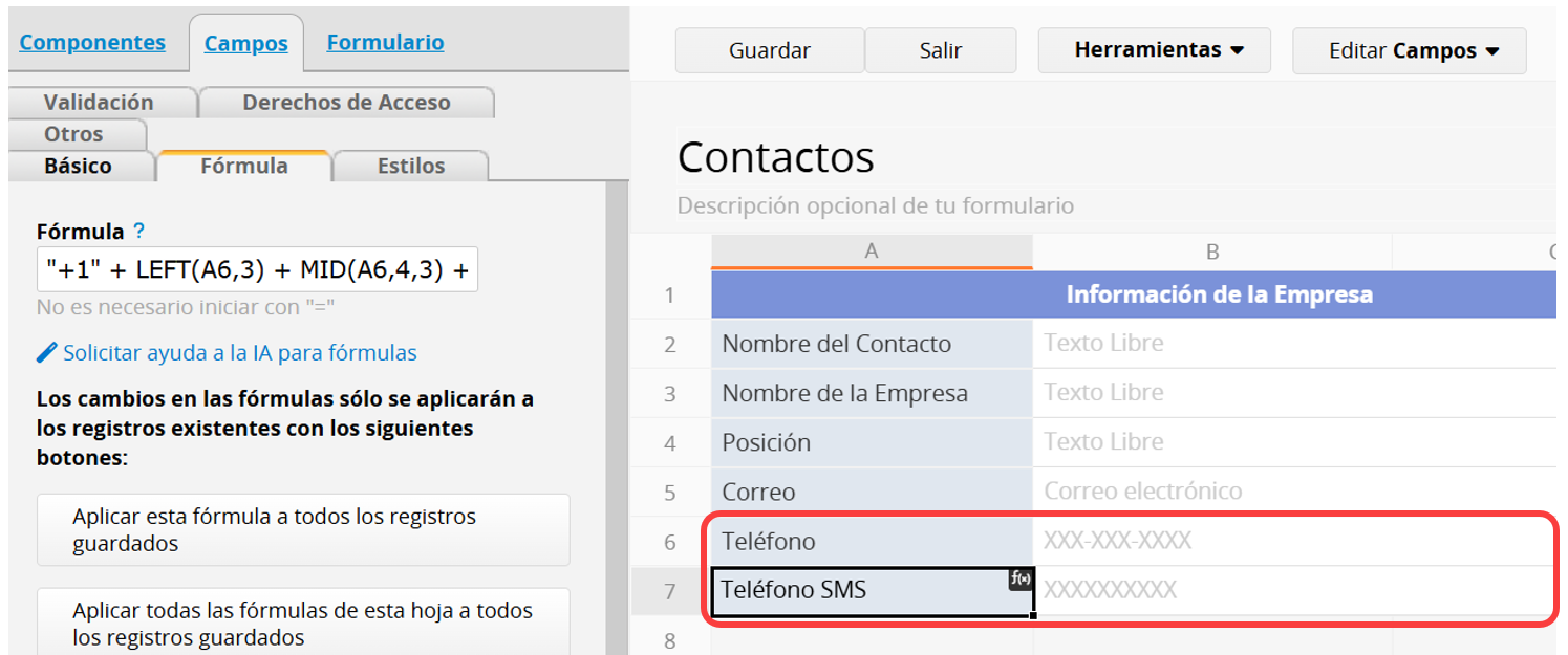 Por ejemplo, el campo "Teléfono" ubicado en A2 con el formato 310-123-4567, puedes crear un campo de texto libre SMS con las fórmulas: "+1"+LEFT(A2,3)+MID(A2,4,3)+RIGHT(A2,4)
