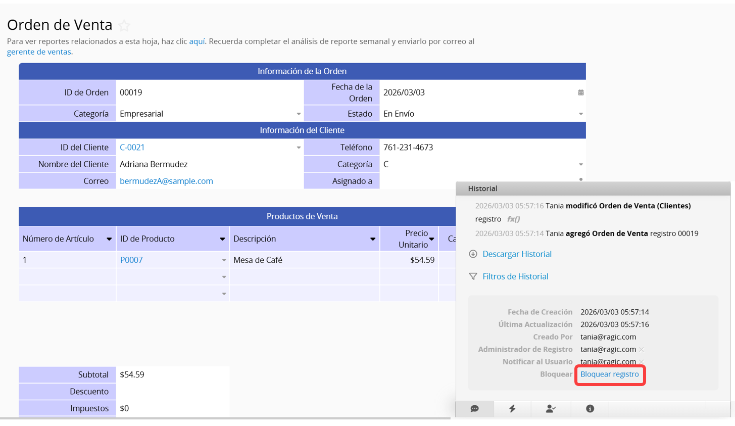 Para evitar que se edite un registro, puedes bloquearlo manualmente. También puedes desbloquearlo en cualquier momento.