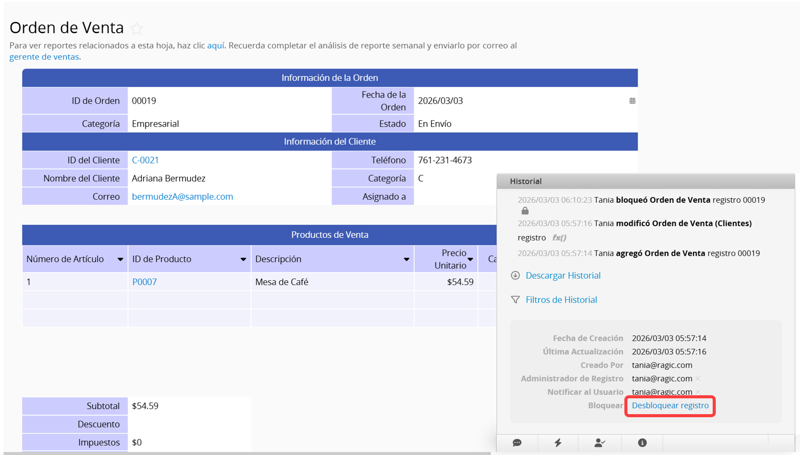 Para desbloquear un registro bloqueado, simplemente haz clic en Desbloquear registro en la misma ubicación.