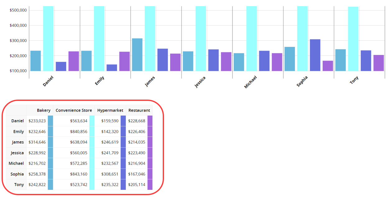 Después de seleccionar los dos campos de categoría, el gráfico de barras se mostrará en la parte inferior. Pasa el cursor sobre el gráfico de barras para ver los valores reales o los porcentajes de cada elemento.