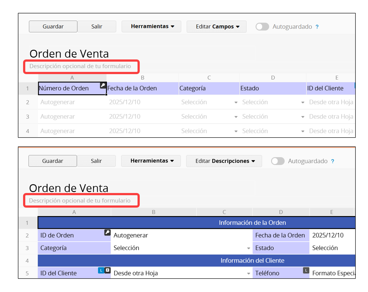 Puedes establecer una descripción de la hoja para indicar el propósito de la hoja o para proporcionar notas sobre puntos importantes a tener en cuenta al completarla, lo que ayuda a los usuarios a comprender mejor cómo usar la hoja o seguir el flujo de trabajo.