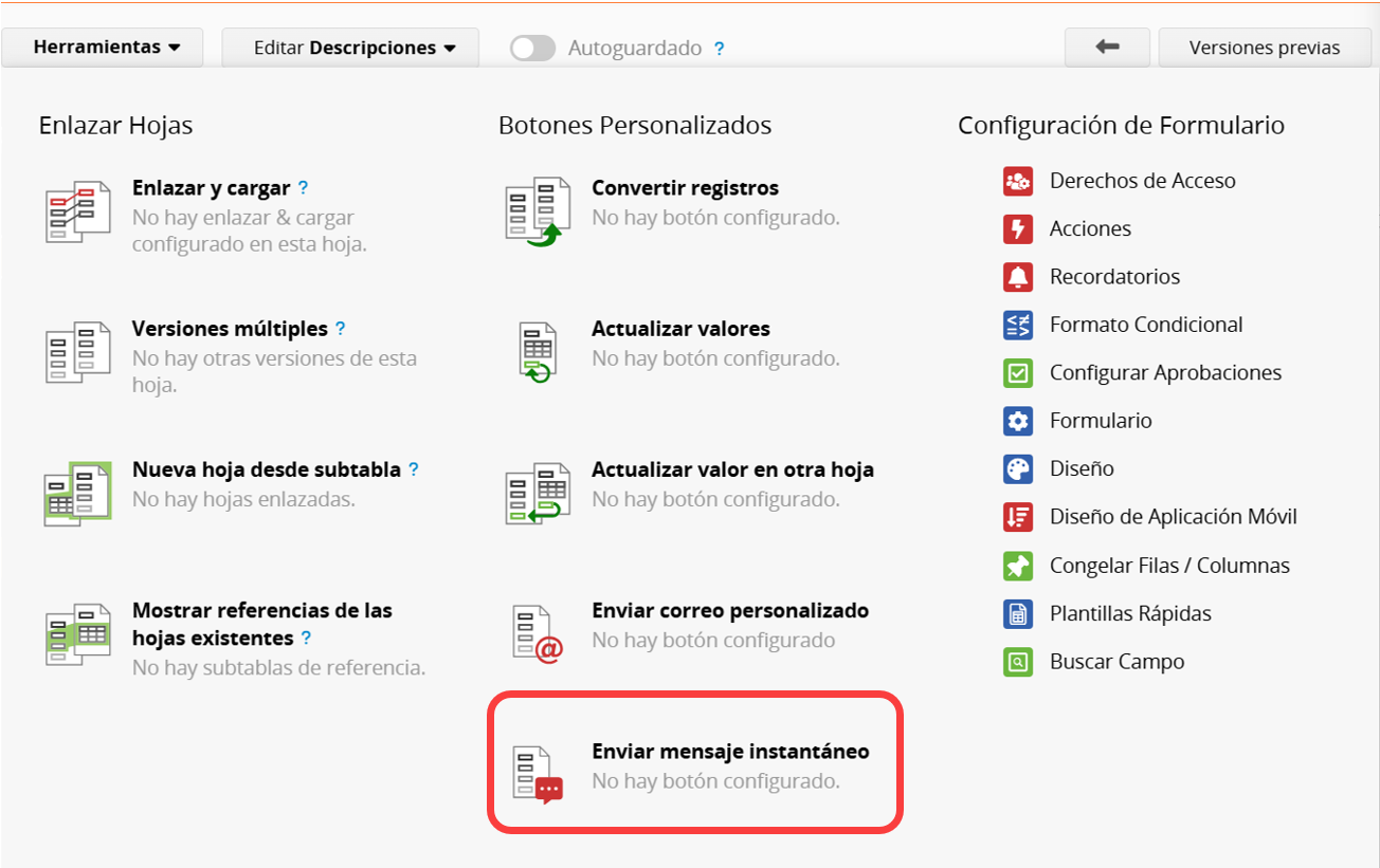 Ve al Modo de diseño en su página de formulario y haga clic en Herramientas > Enviar mensaje instantáneo en la sección Botones Personalizados.