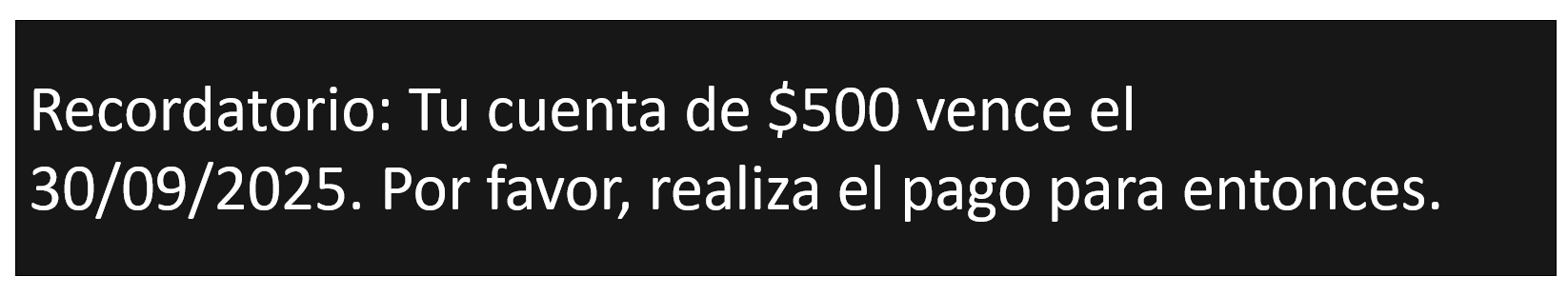 2. Contenido: Cada SMS tiene un límite de 160 caracteres (alfanuméricos, de ancho medio) o 70 caracteres (chino/inglés/números, incluyendo puntuación). Si el mensaje supera el límite, se dividirá en varios SMS y se cobrará una tarifa por mensaje. Consulta esta sección para obtener más información. Se admiten variables; consulta aquí para ver las variables admitidas.