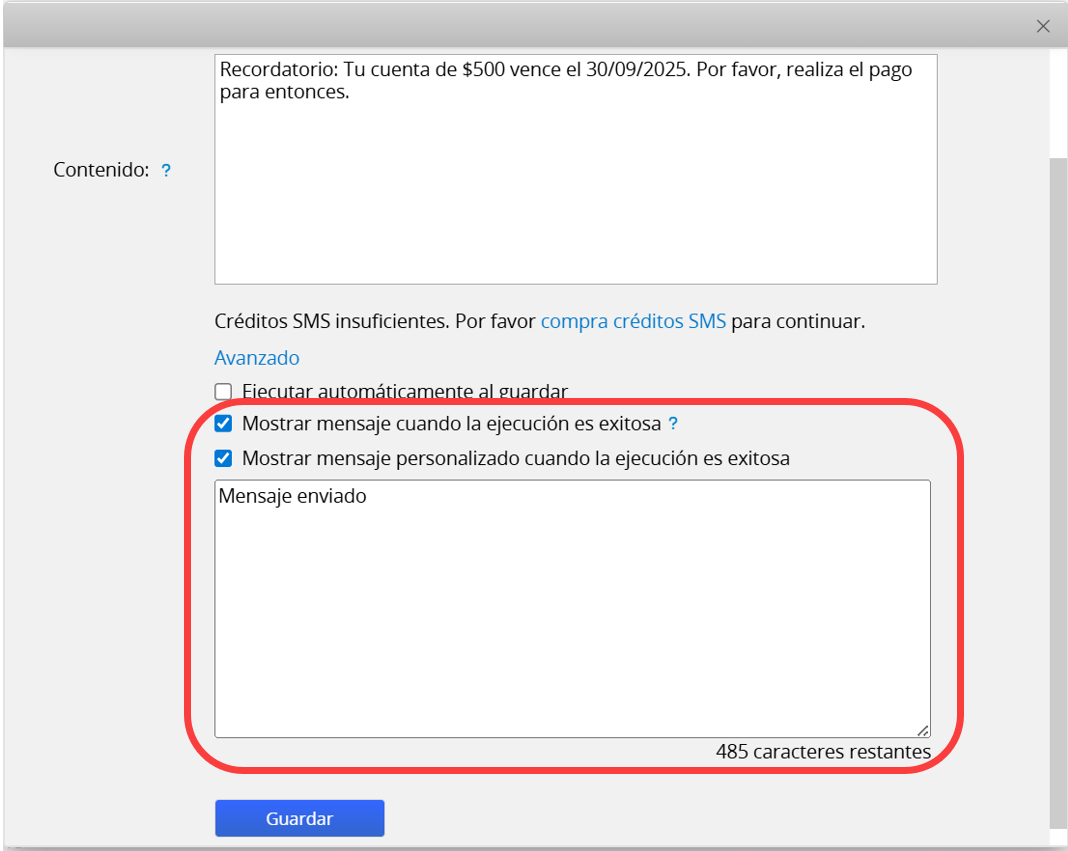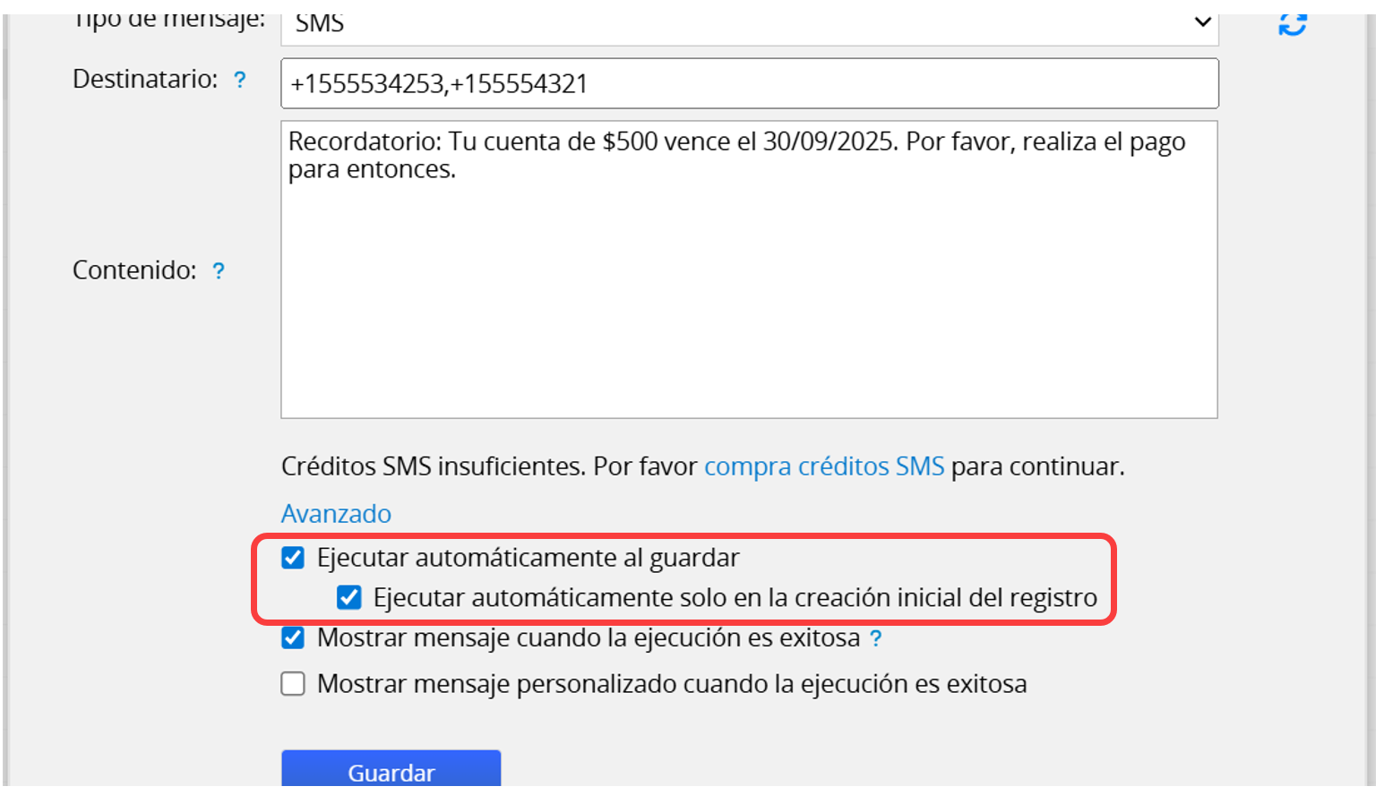 En la configuración avanzada, puedes marcar la opción Ejecutar automáticamente al guardar. Por defecto, el envío de los mensajes se ejecutará automáticamente solo en la creación inicial del registro.
