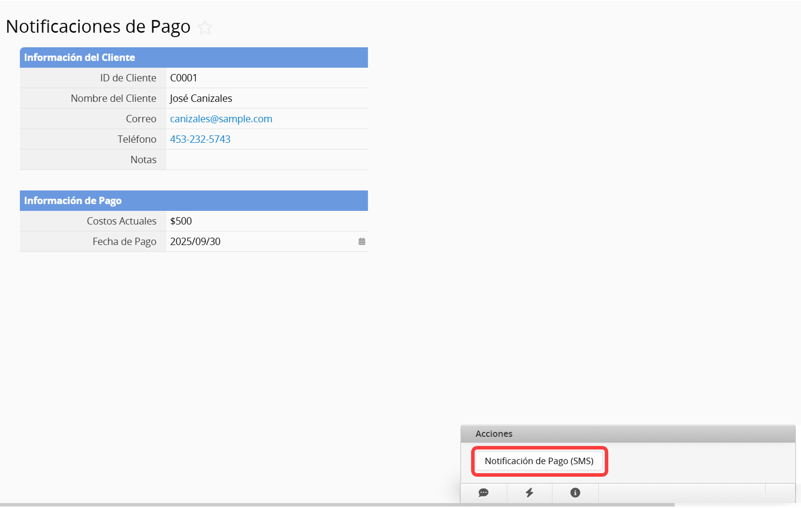 El botón de acción Enviar mensaje instantáneo te permite crear plantillas que incluyen valores guardados en tu base de datos. Los usuarios pueden presionarlo para enviar mensajes directamente a los destinatarios designados. Esta función ofrece mayor flexibilidad de personalización. Actualmente, puedes usarlo para enviar mensajes personalizados como recordatorios de citas, promociones de marketing o notificaciones de recogida a través de SMS.