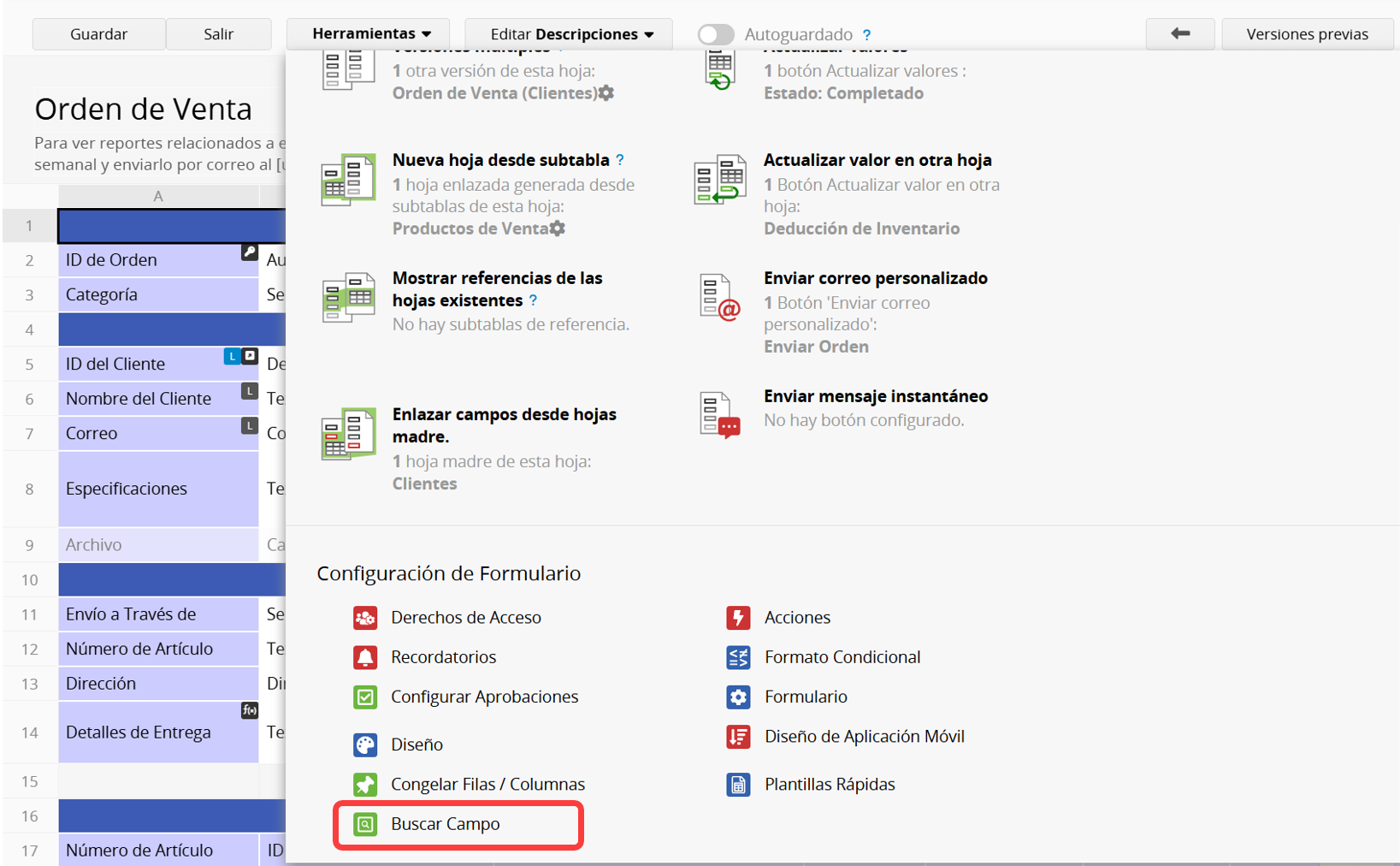 1. Haz clic en Buscar Campo en Configuración de Formulario en Herramientas.