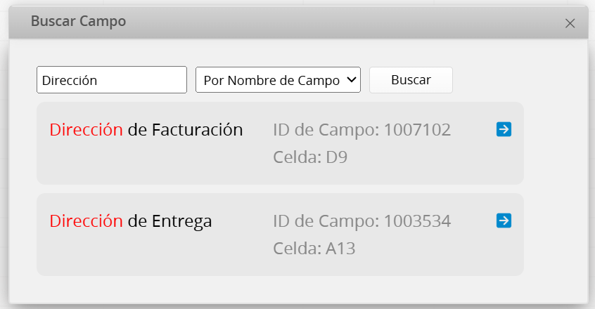 Al ingresar una palabra clave y hacer clic en "Buscar", se mostrarán todos los campos coincidentes, incluyendo su nombre, ID y posición en la celda (por ejemplo, B17). Si un campo está ubicado dentro de una Sección de Hoja, también se mostrará el nombre de la sección.