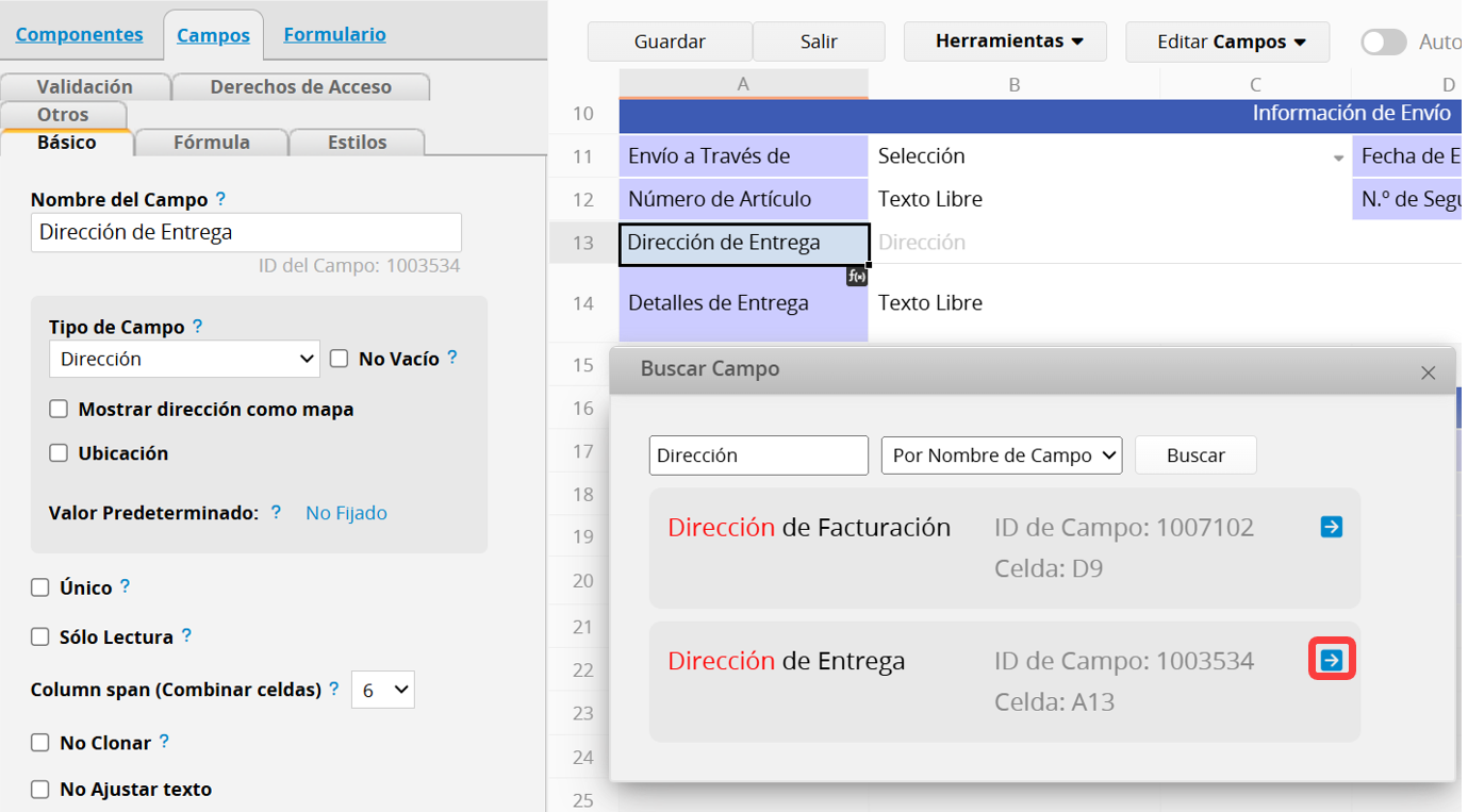 Haz clic en la flecha azul junto a un campo para seleccionarlo automáticamente en el panel Configuración de campo, en la barra lateral izquierda. El campo se resaltará con un borde negro.