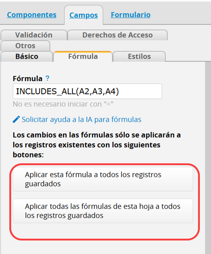 | INCLUDES_ALL(Campo de selección múltiple/imagen/archivo adjunto, valor1, valor2,...) | Si todos los valores listados (que pueden ser de cualquier tipo o valor de campo) están incluidos en las opciones, devuelve verdadero. |