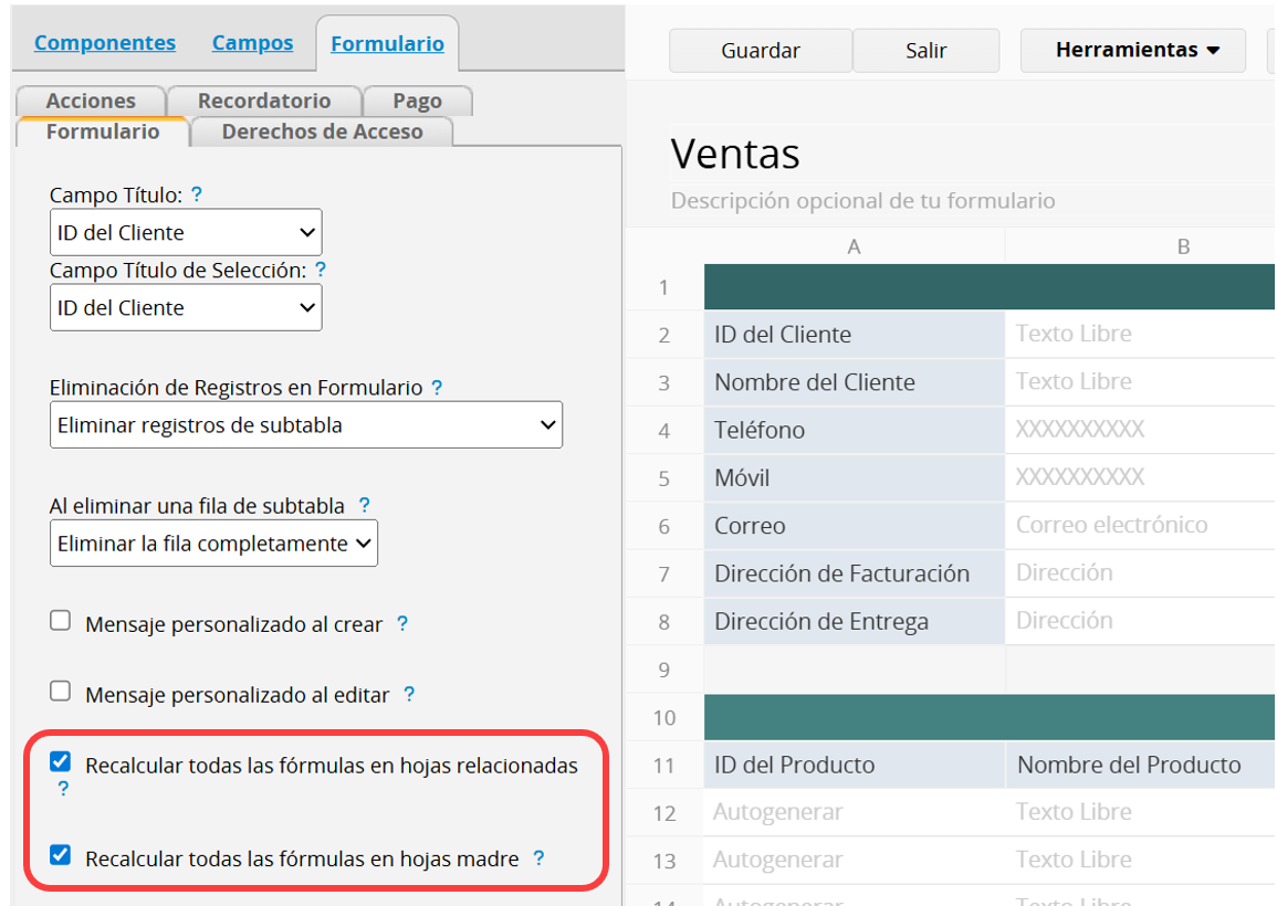 Para ejecutar un recálculo de fórmula en registros relacionados en otras hojas, vaya a Configuración de formulario > Configuración de formulario > Recalcular todas las fórmulas en hojas principales o relacionadas.
