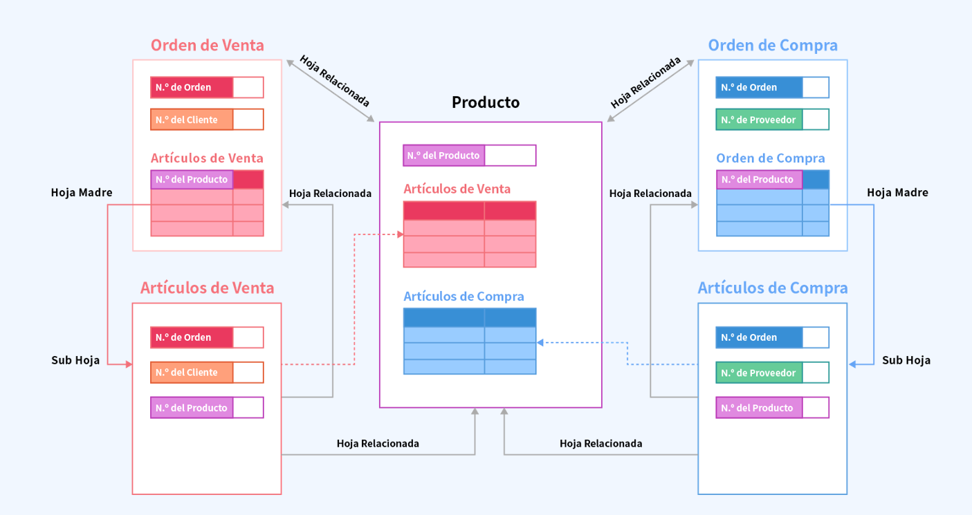 El siguiente diagrama muestra los conceptos de diseño y la lógica entre hojas madre, hojas dependientes y hojas relacionadas.