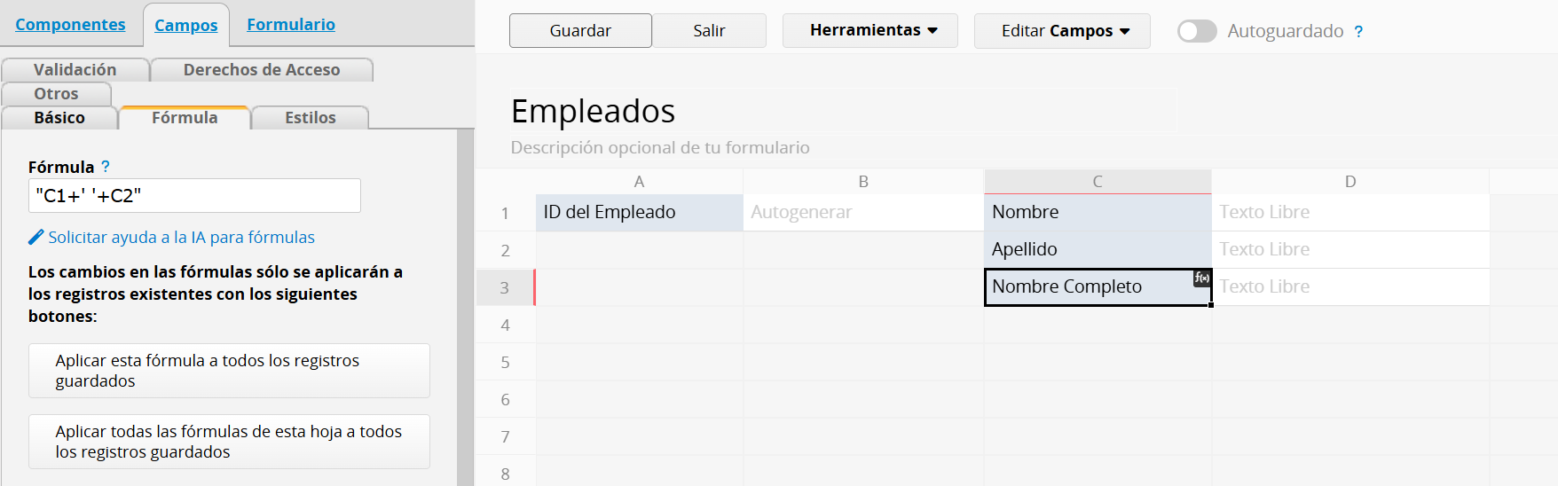 | MID(valor,inicio,[longitud]) | Extrae un número determinado de caracteres del centro de una cadena de texto proporcionada. Para el carácter inicial, el primer carácter del campo referenciado se especificará como 0. Por ejemplo, si el valor del campo A1 es ABCD, al establecer la fórmula como MID(A1,1,2) en otro campo, devolverá BC. |