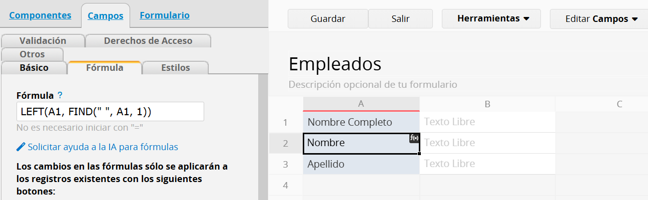 Si desea mostrar el nombre y el apellido en campos separados, puede utilizar las siguientes fórmulas: