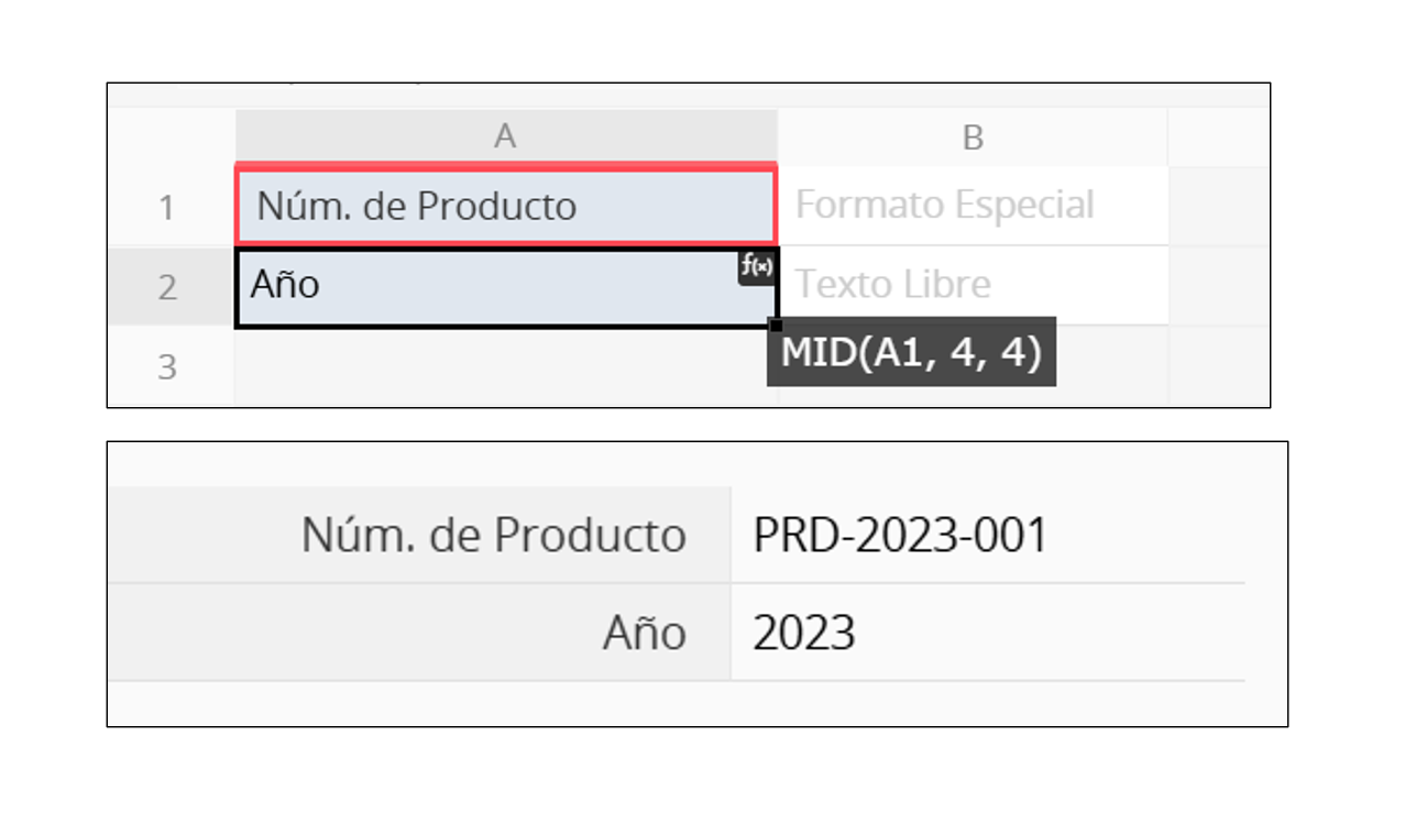 Si el valor del campo "N.º de producto" es "PRD-2023-001", donde los cuatro dígitos centrales indican el año, introduzca MID(A1, 4, 4) en el campo "Año".