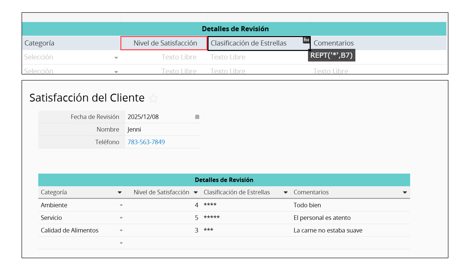En el campo "Calificación de estrellas", ingresa REPT("*", "Calificación de satisfacción") para representar la puntuación con estrellas.