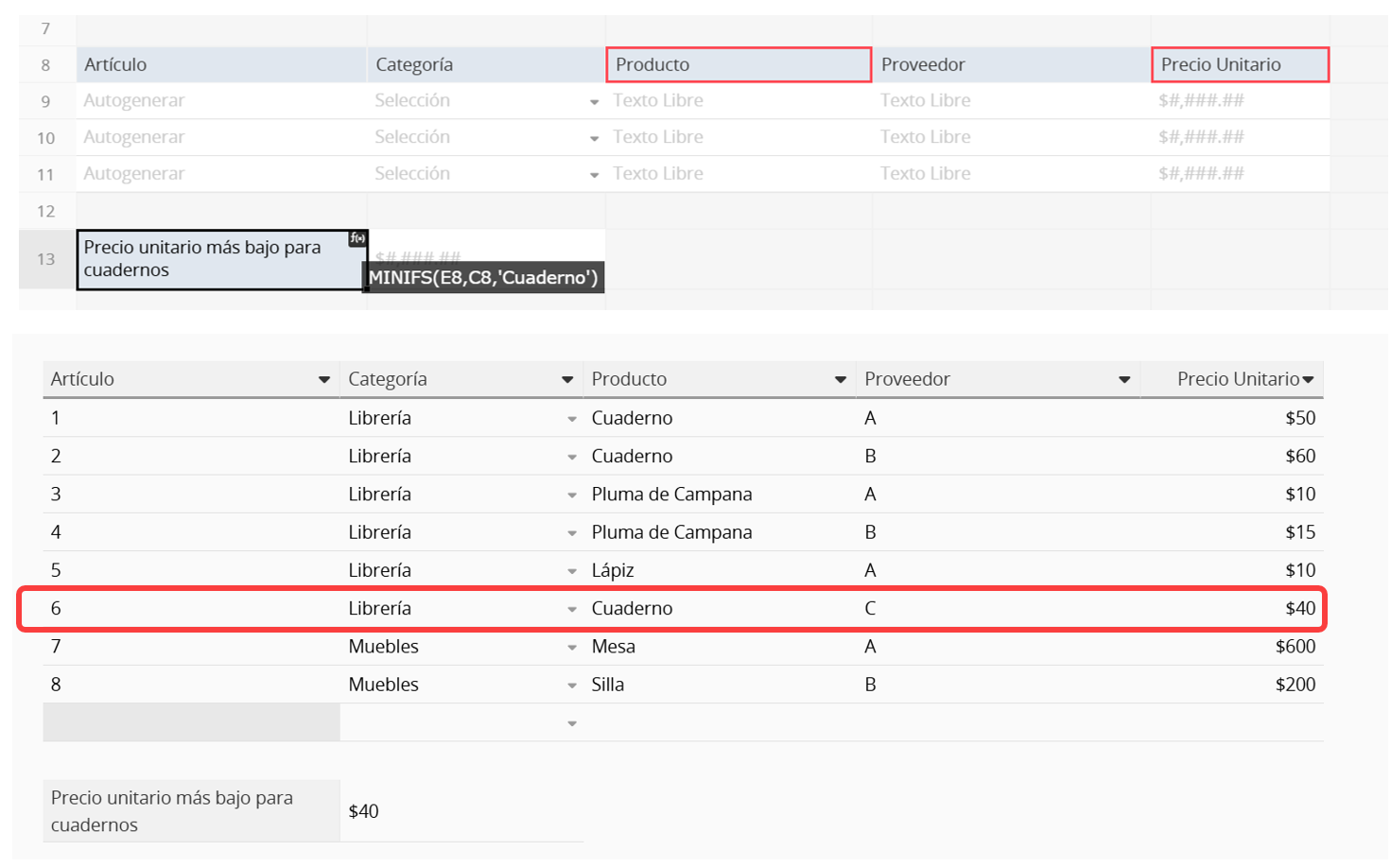 Ejemplo 2 (Criterios Múltiples): Devuelve el precio unitario más bajo por categoría y proveedor. Para encontrar el precio unitario más bajo donde la categoría es "Papelería" y el proveedor es "Proveedor A", introduce: MINIFS("Precio Unitario", "Categoría", "Papelería", "Proveedor", "A").