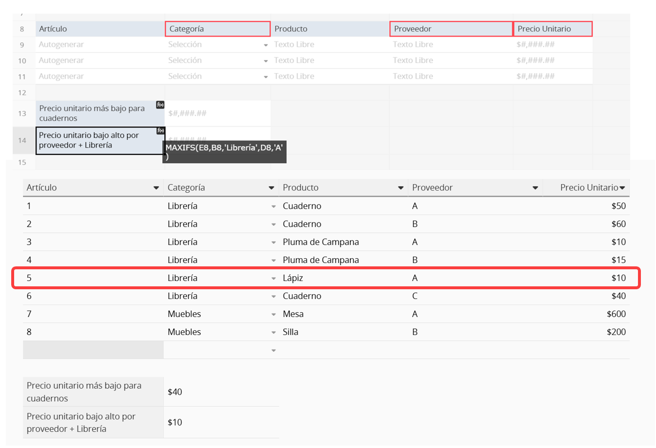 Ejemplo 2 (criterios múltiples): Devolver el precio unitario más alto por categoría y proveedor. Para encontrar el precio unitario más alto donde la categoría es "Papelería" y el proveedor es "Proveedor A", introduzca MAXIFS("Precio Unitario", "Categoría", "Papelería", "Proveedor", "A").
