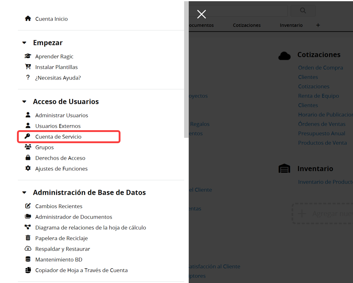 Haz clic en el ícono de hamburguesa en la esquina superior izquierda y selecciona Cuenta de Servicio en Acceso de Usuario.