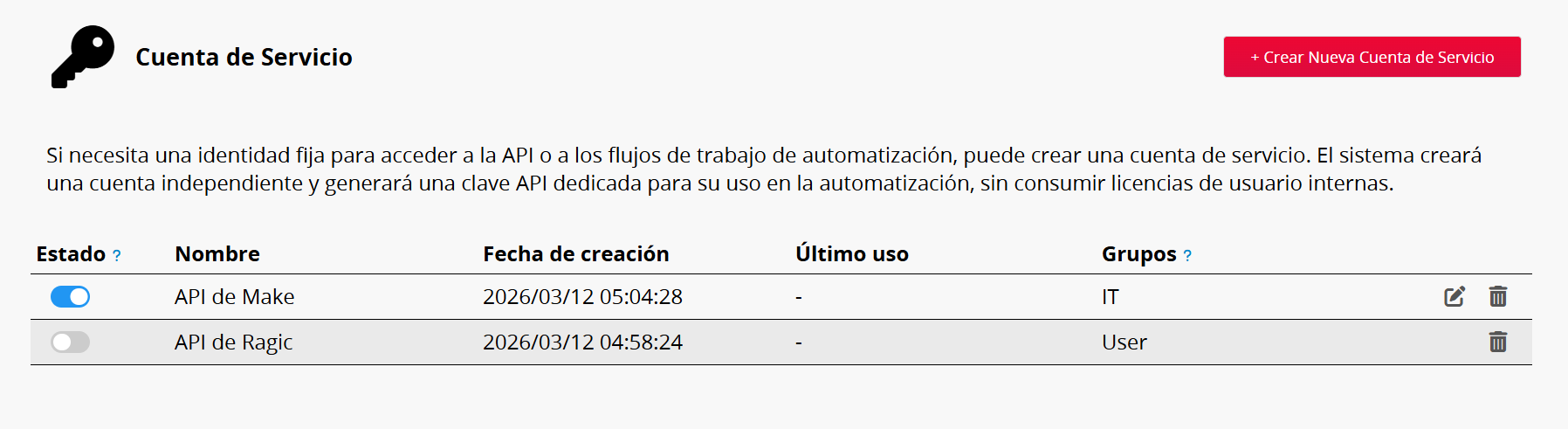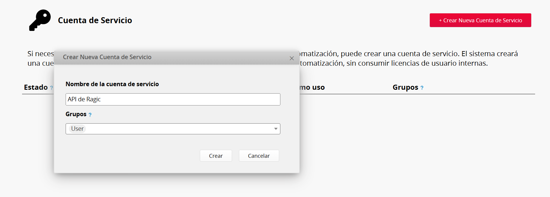 Si necesitas una identidad fija para acceder a la API o a los flujos de trabajo de automatización, puede crear una cuenta de servicio. El sistema creará una cuenta independiente y generará una clave API dedicada para su uso en la automatización, sin consumir licencias de usuario internas.