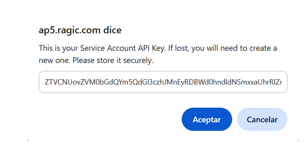 Una vez creada la cuenta de servicio, una ventana mostrará su clave API.